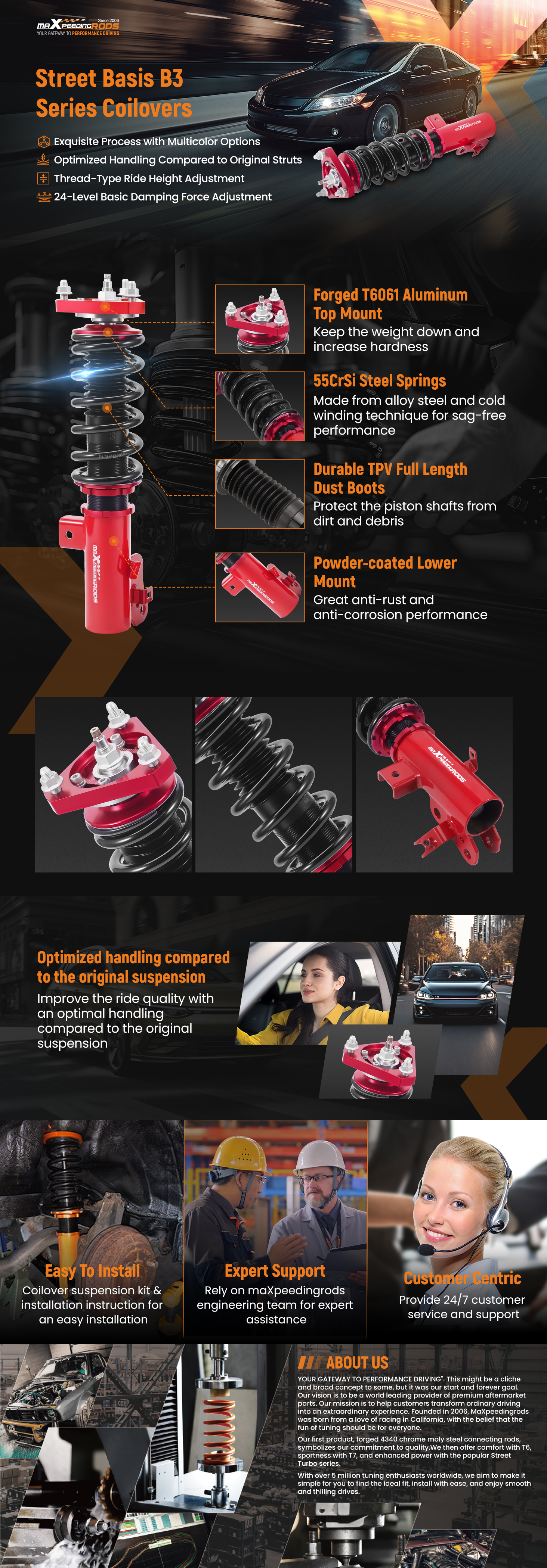 - Reinforced Rubber Bushing Upper Mount: Specifically designed for each vehicle, enhances silence and comfort. Adjustable camber angle for certain strut mechanism suspension cars.