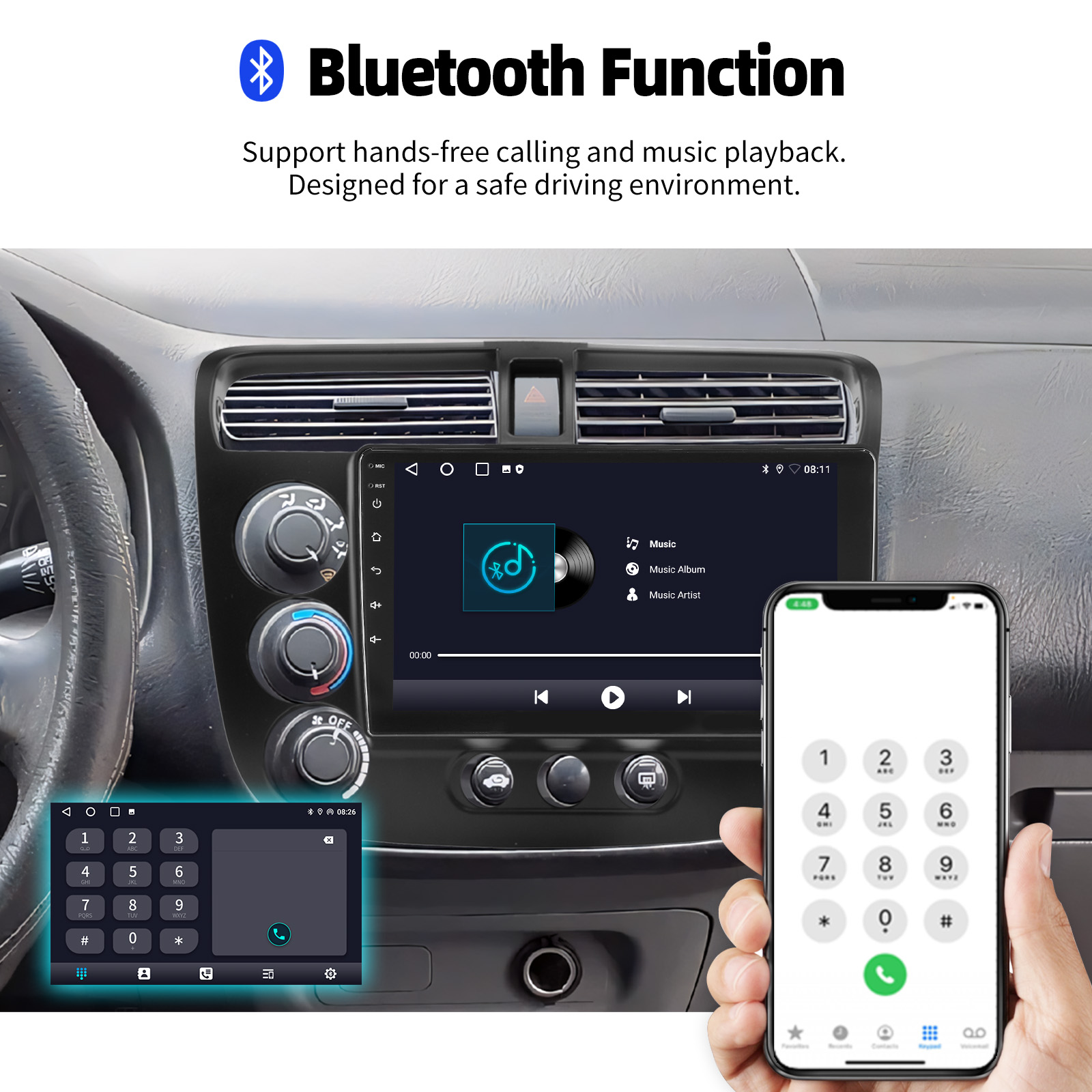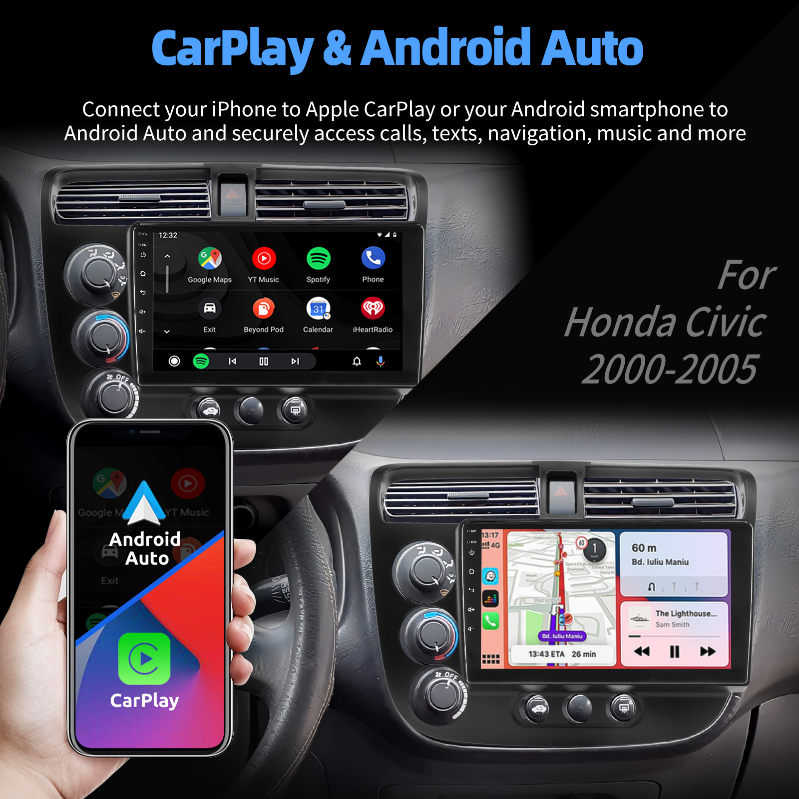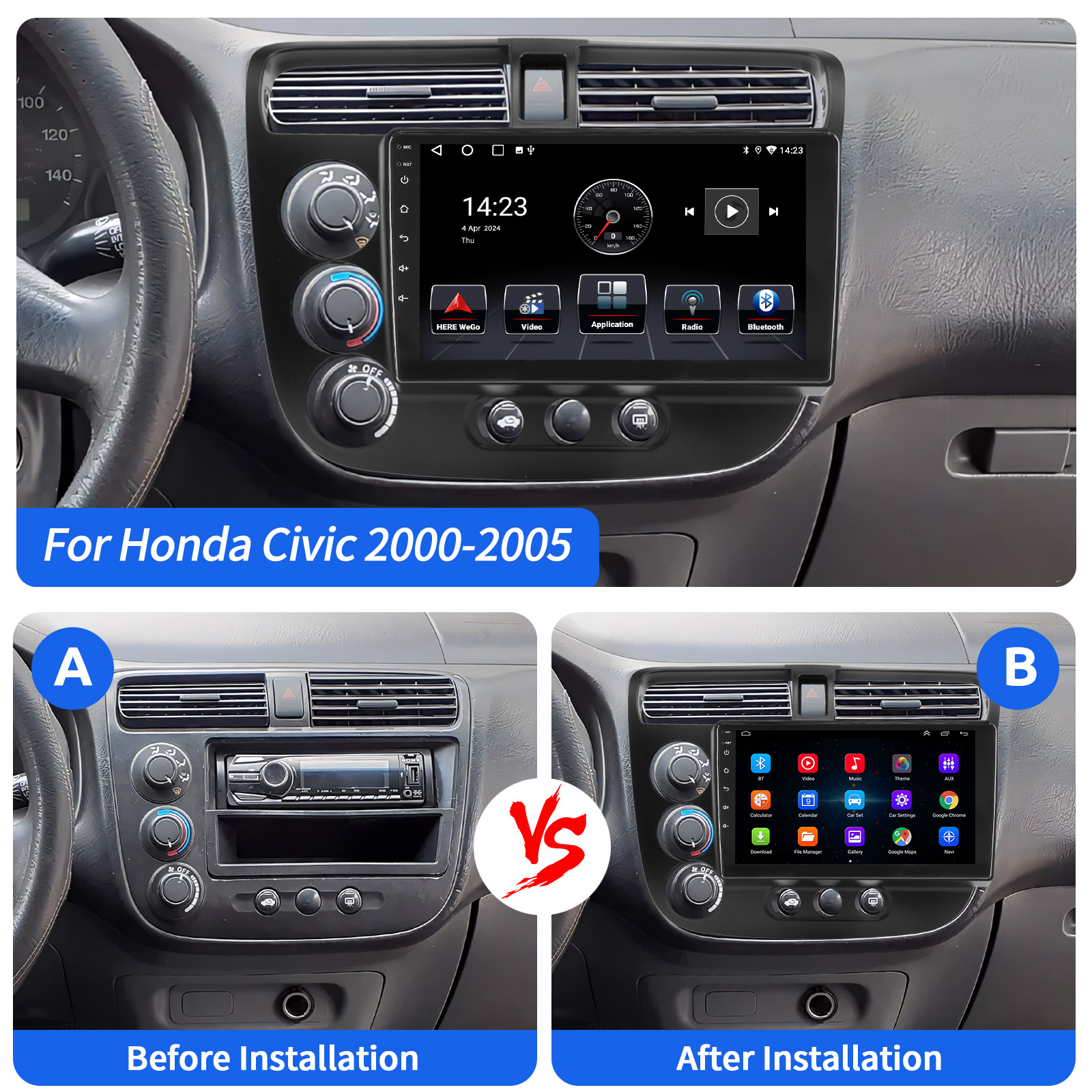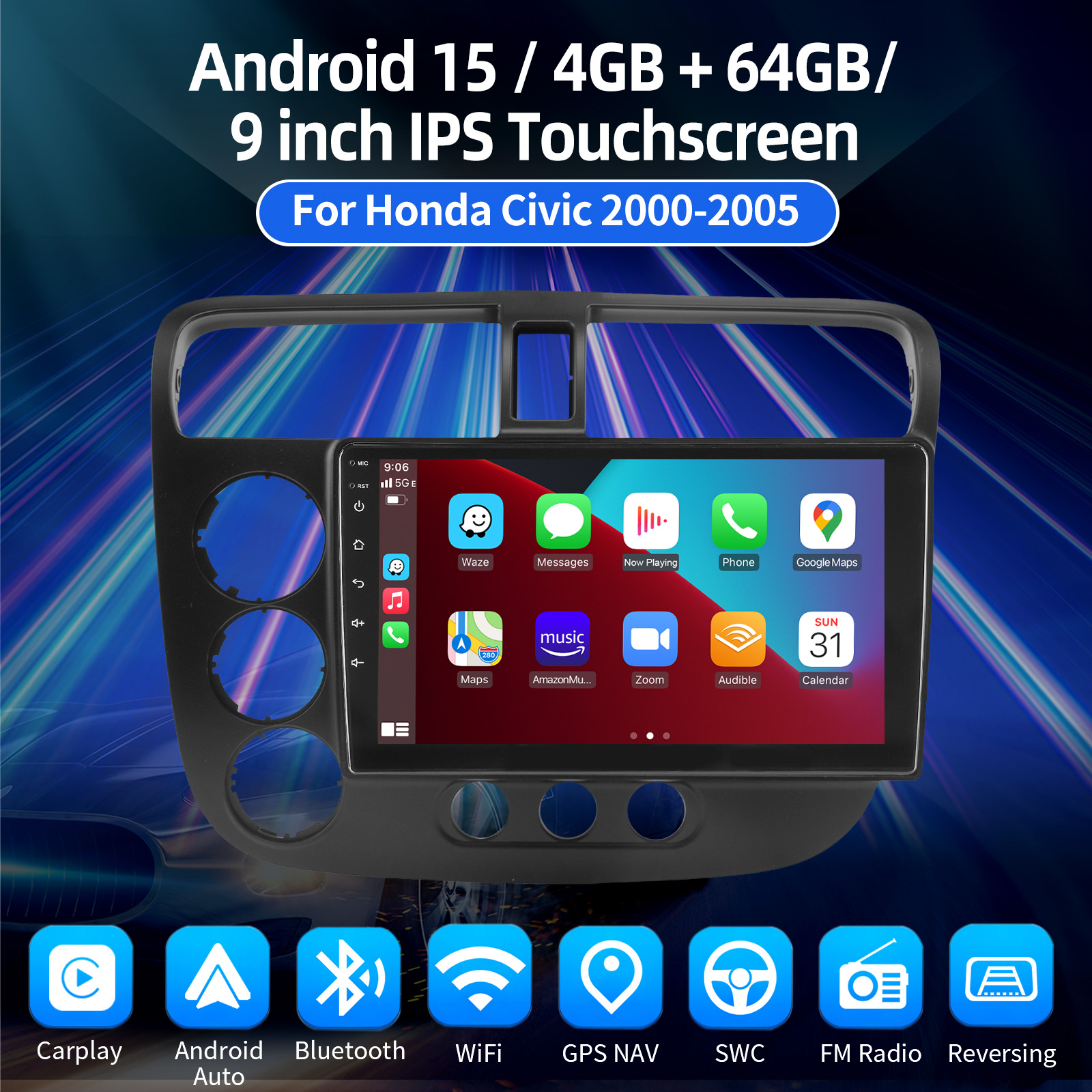 9 Inch Android 15 Car Radio For Honda Civic 2000-2005: The Android car radio with 9" 1280* 720 HD capacitive touchscreen, 4GB RAM and 64GB ROM allows you to download your favorite apps and videos, so driving is no longer boring. No extra frame, no cable change, plug and play. It comes with Canbus and supports most of the original functions: steering wheel control, reverse signals and reading original computer data, etc.