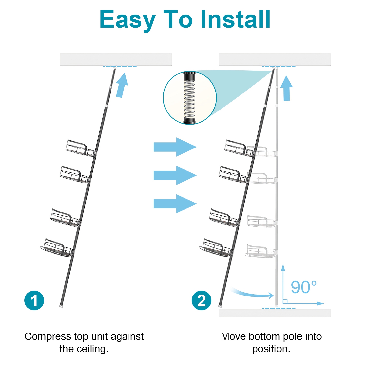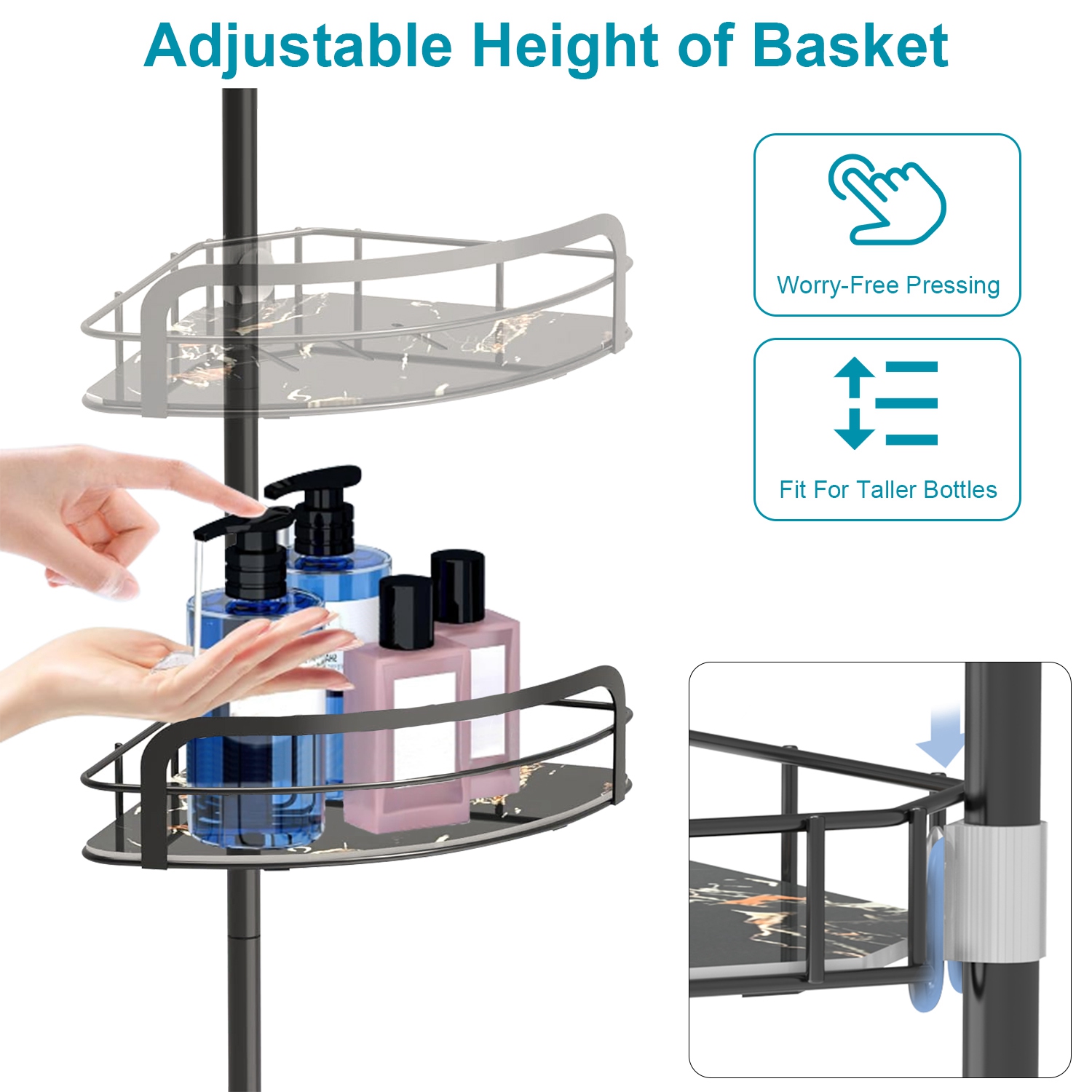 Adjustable Height For Most Showers:Adjustable height ranging from 8.66in to 116.14in,the standing corner shower caddy can perfectly fit for high-rise apartment or a low-rise residence,without any cutting or modifications demands. What’s more,the fully adjustable baskets allow you to easily move them up or down to accommodate taller bottles,ensuring optimal storage capacity and convenient accessibility.
