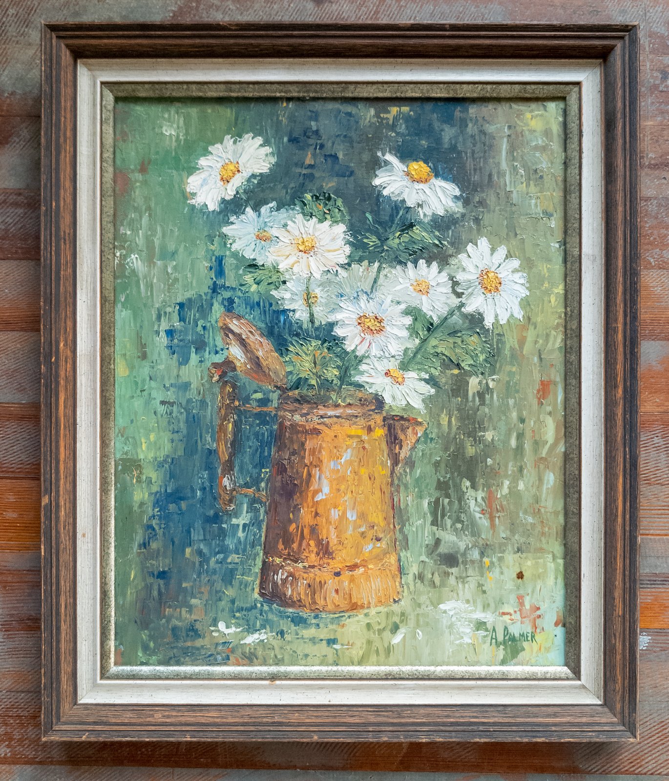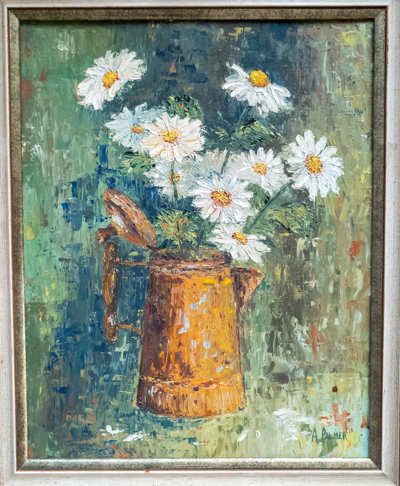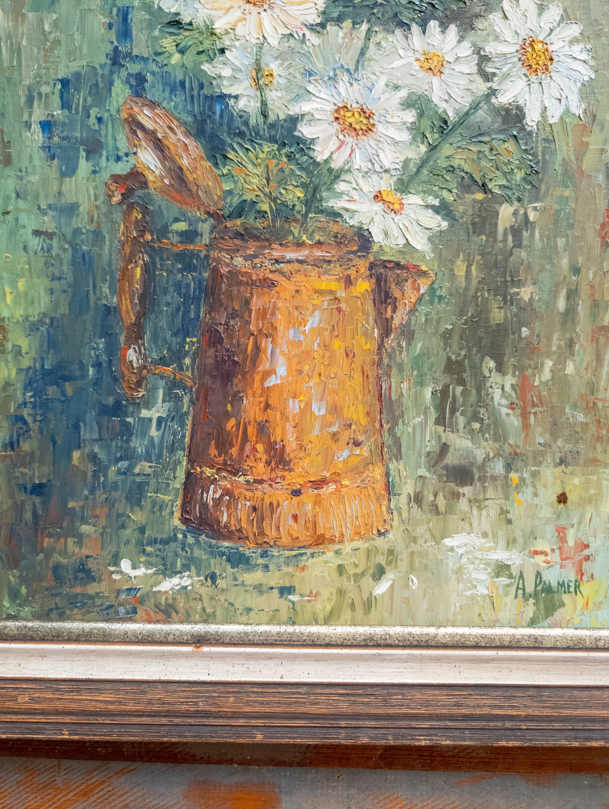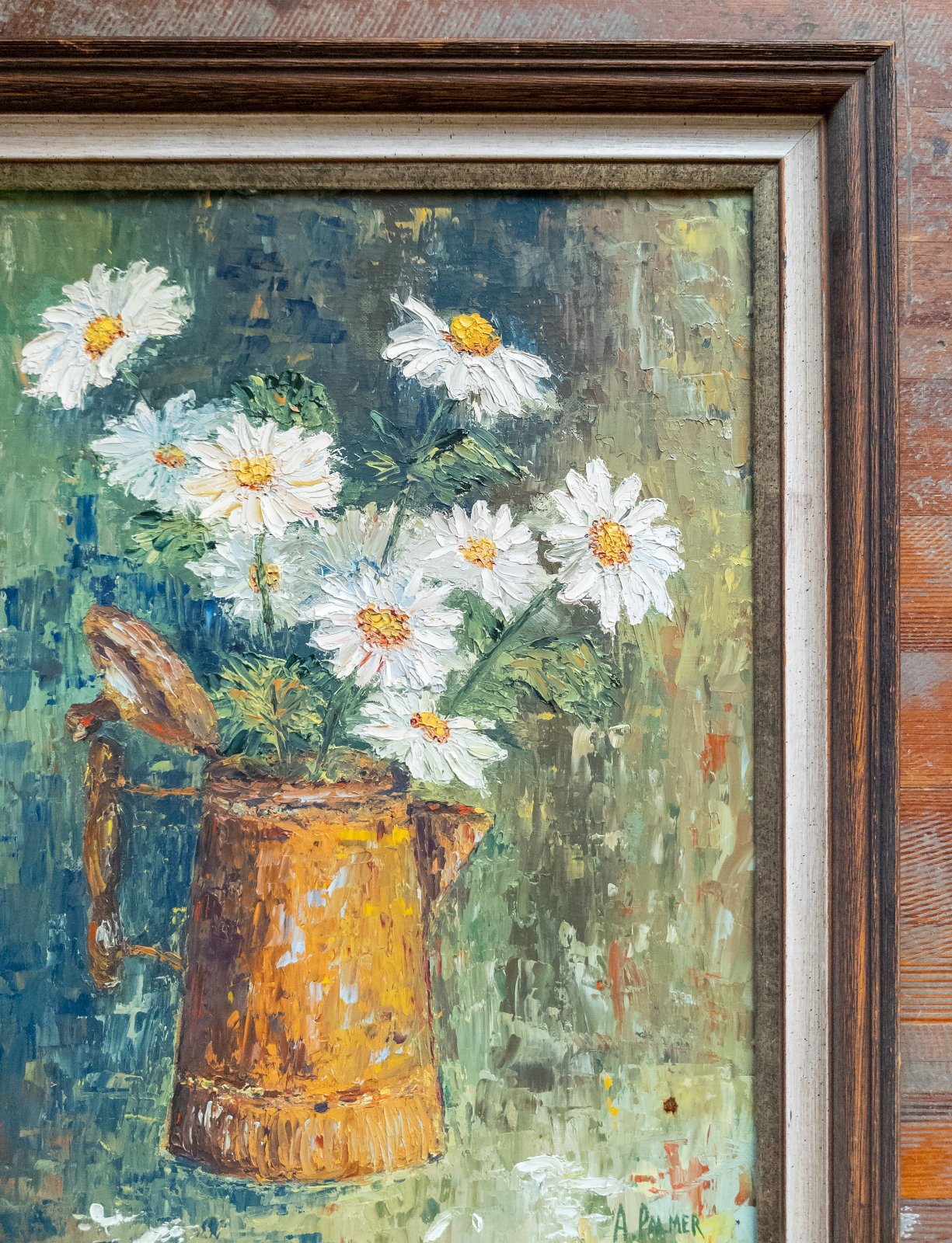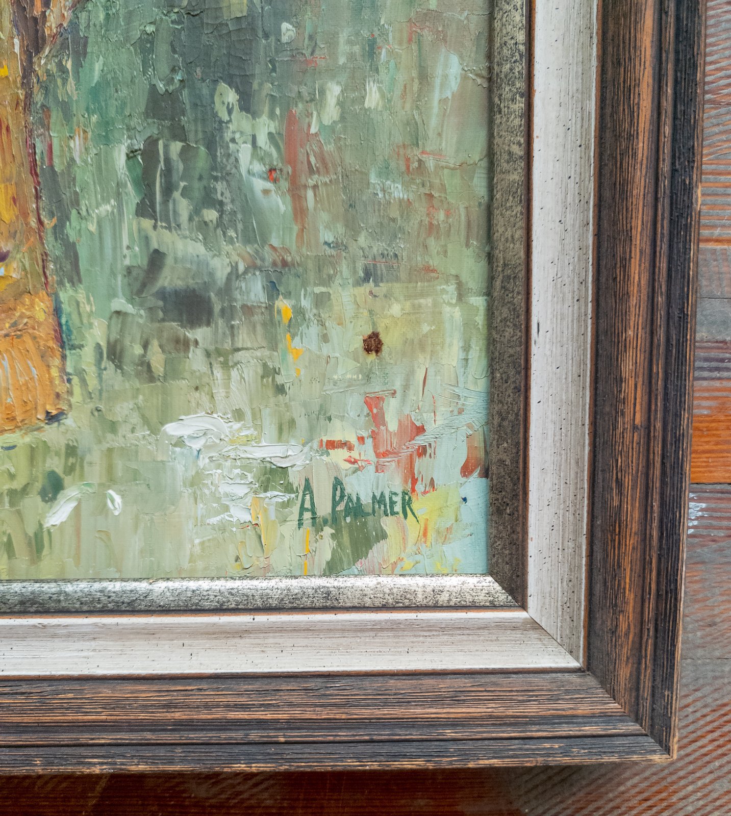 We are selling this Mid-Century impressionist style still life painting of flowers. The painting is well executed in oils on a canvas covered cardboard artist panel. The painting is signed A Palmer and has old business card from the artist on the back.