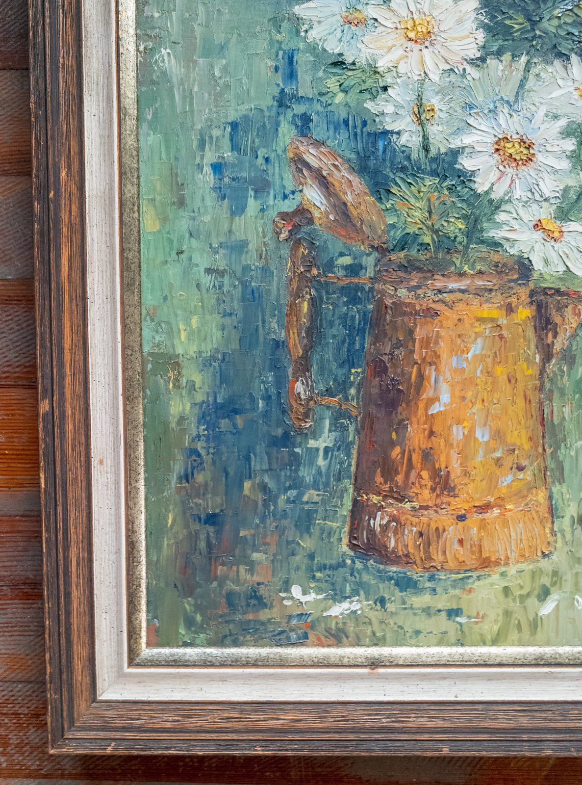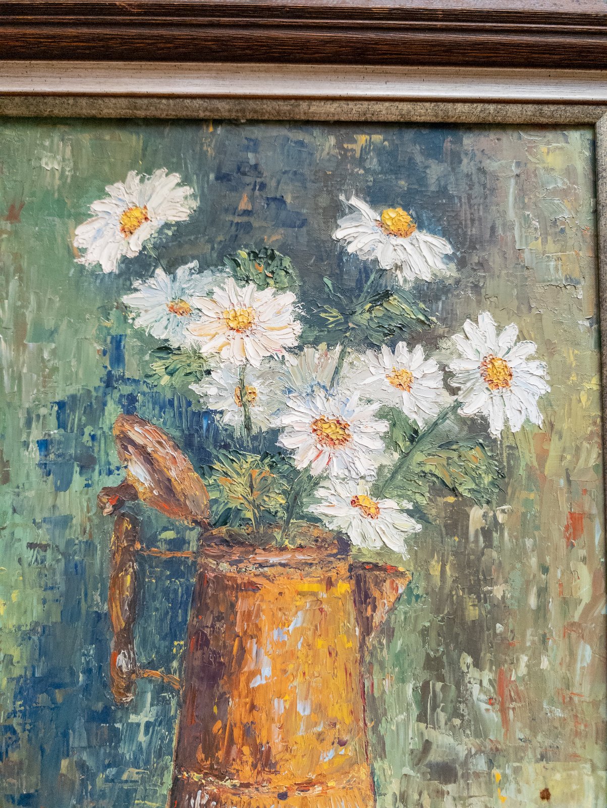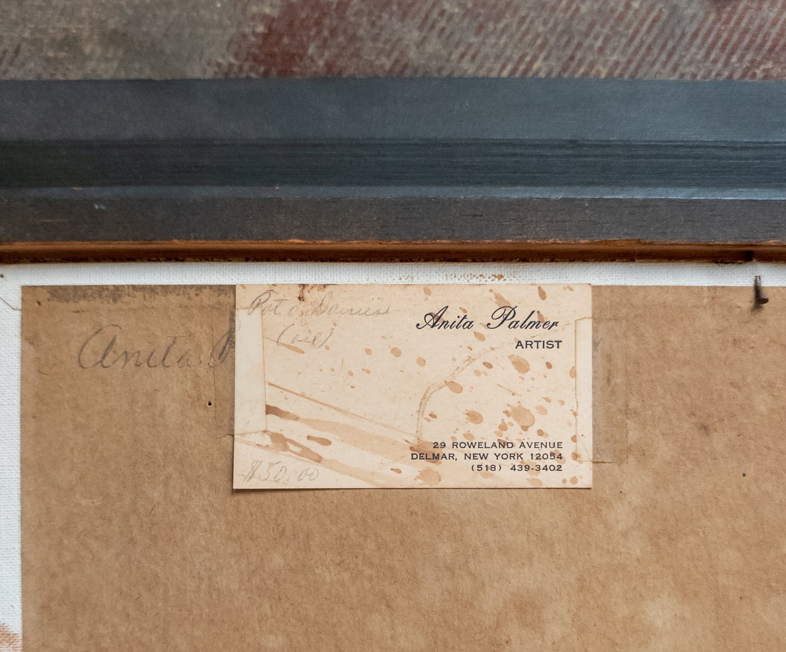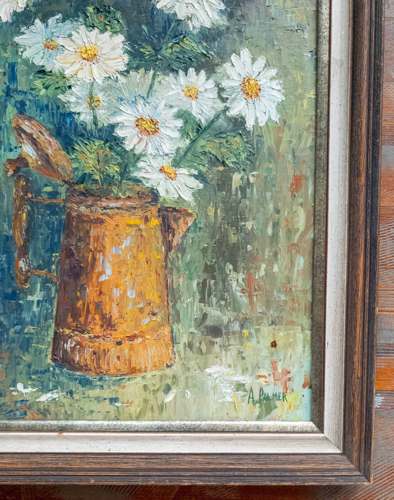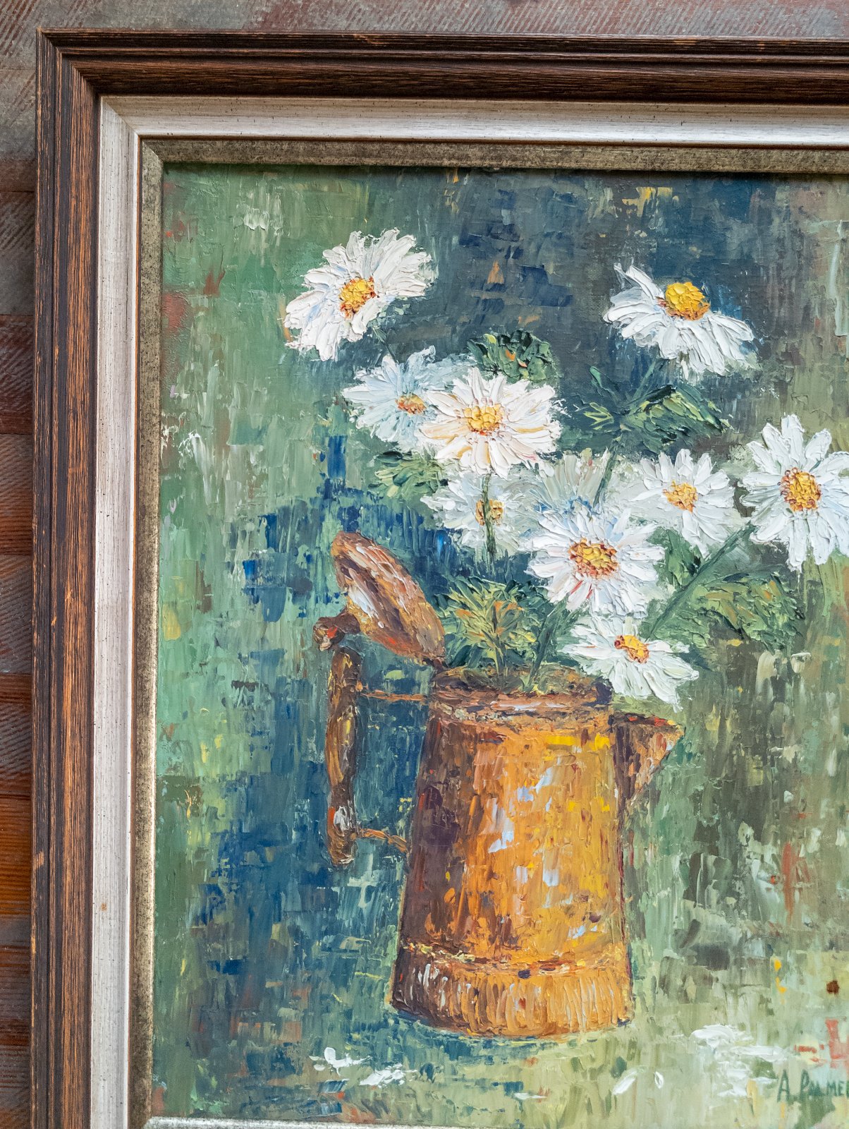 We are selling this Mid-Century impressionist style still life painting of flowers. The painting is well executed in oils on a canvas covered cardboard artist panel. The painting is signed A Palmer and has old business card from the artist on the back.