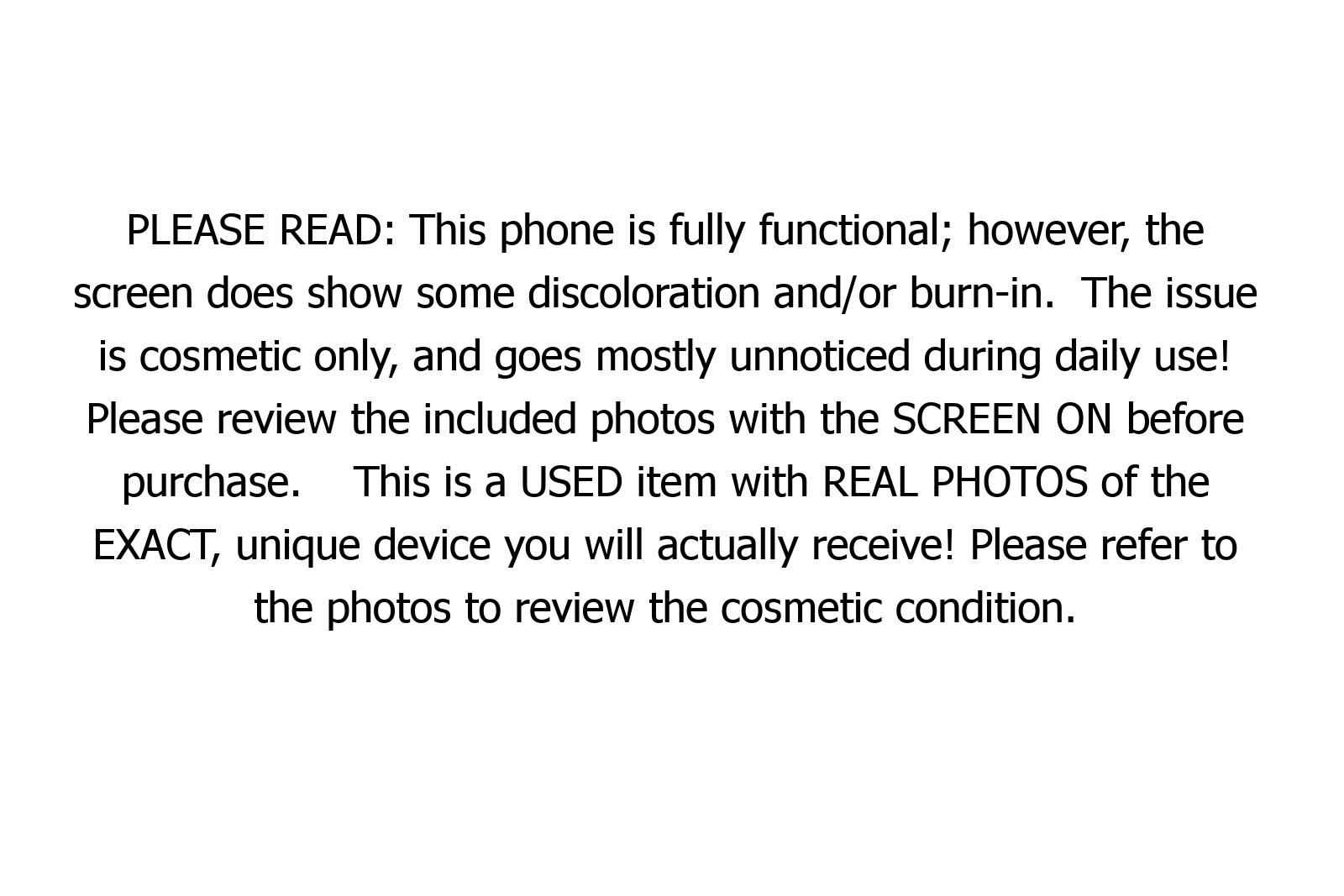 PLEASE READ: This phone is fully functional; however, the screen does show some discoloration and/or burn-in. The issue is cosmetic only, and goes mostly unnoticed during daily use! Please review the included photos with the SCREEN ON before purchase. This is a USED item with REAL PHOTOS of the EXACT, unique device you will actually receive! Please refer to the photos to review the cosmetic condition.