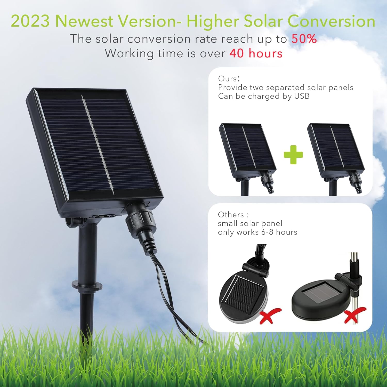 【Provide Two Separated Solar Panels】The new solar light panel with a built-in 3V, 1200mAh NiMH battery, charged by USB, can be inserted into the ground or mounted on the wall. We provide a replacement kit for those concerned about cloudy days. Compared to integrated firefly lights, the versatile standalone solar panel allows you to place the light clusters freely, as long as the solar panel is exposed to sunlight.(Note:Do not place the solar panel of the solar light under the streetlight.)