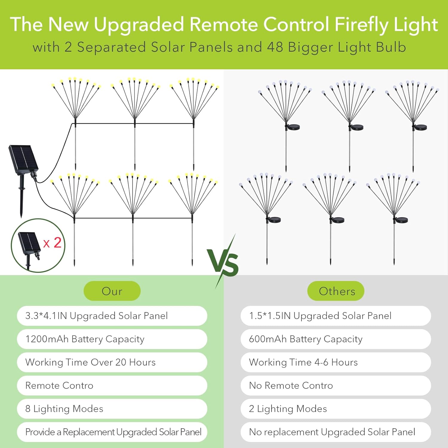 Seedfactor 6 Packs Solar Garden Lights – New Upgraded Firefly Lights with 2 Solar Panels, Remote Control, 48 Bigger Light Bulb, Outdoor Lights Decorative Waterproof for Pathway Landscape Yard Patio