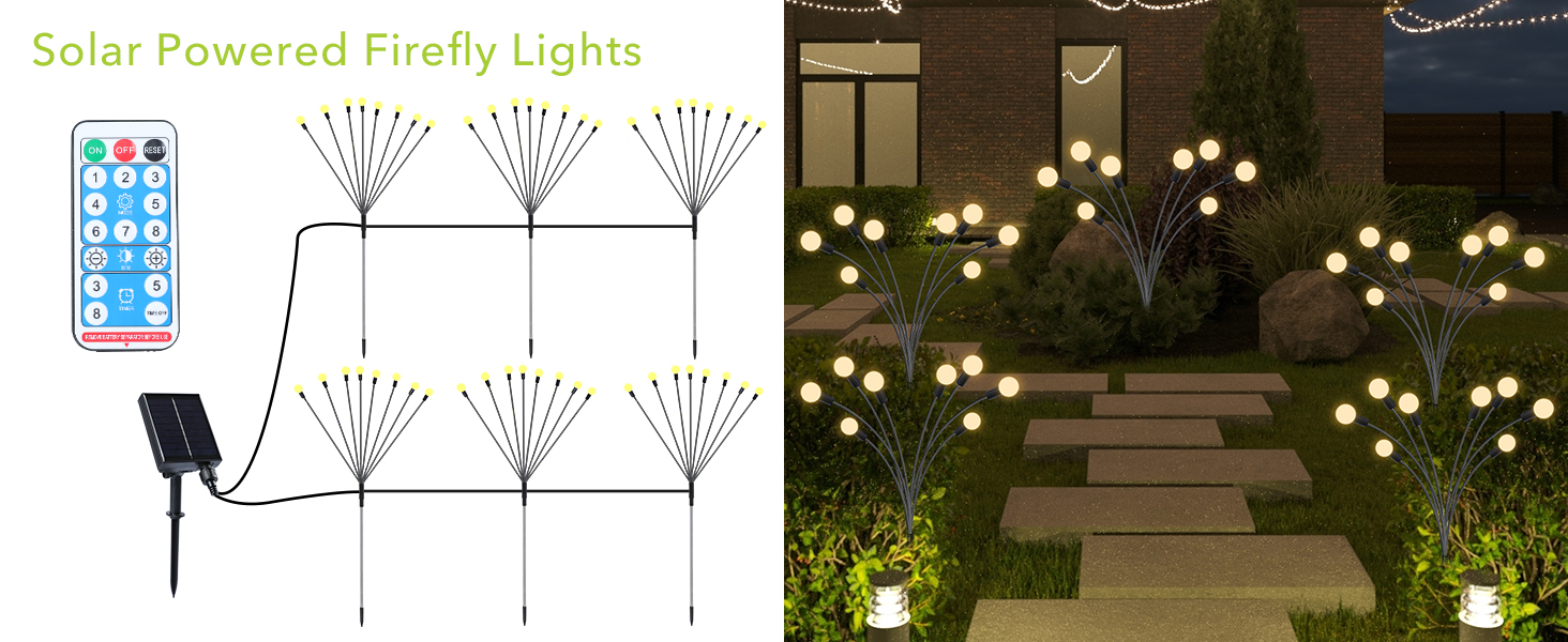 【Remote Control】You can use the remote to choose from 3 levels of brightness, set the working hours, and choose from 8 different lighting modes, which include combination, in waves, sequential, slogs, chasing/flash, slow fade, twinkle/flash, and steady on. Solar garden lights reproduce the lifelike flash, flicker, and fade of Mother Nature's real fireflies.