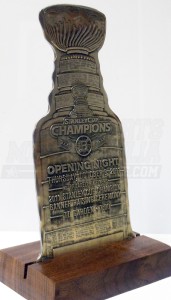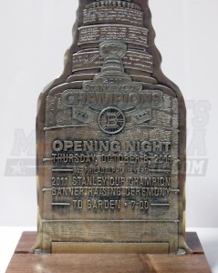 Aluminum ticket issued for opening night during the Boston Bruins raising of the 2011 Stanley Cup Champions banner with wood stand.