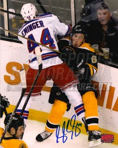 New York Rangers Steve Eminger hand signed in blue this 8x10 photo of Eminger's hard check on Boston Bruins Brad Marchand during a private signing held for Your Sports Memorabilia Store on October 3, 2012.