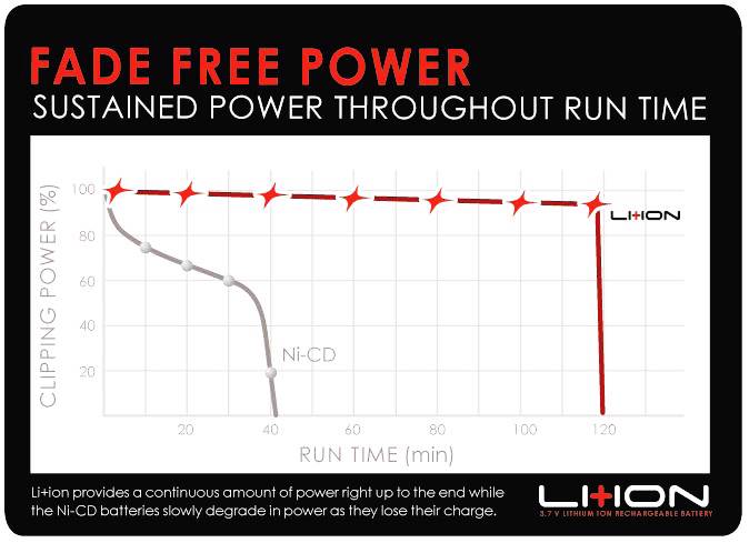 Maintain constant power throughout the charge. Regular batteries start losing power as soon as they start running. The Octane clipper holds steady power for as long as the battery runs, without torque reduction in the motor.