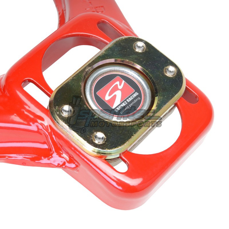 Each Pro Series Camber Kit includes high-quality rubber bushings and Skunk2’s all-new, one-piece, forged Pro Series Ball Joints, which feature low-profile top plates for additional clearance between themselves and the shock towers, higher clamping loads for no-slip performance, and a unique design that allows for maximum adjustability. Skunk2 ‘s cadmium-plated, Pro Series Ball Joints can also be adjusted from the bottom up, which allows for quicker and easier adjustments—especially on lowered vehicles with shortened shock bodies. In addition to improved ride characteristics and reduced tire wear on lowered vehicles, Skunk2's proprietary design helps reduce structural fatigue and failure commonly associated with other camber adjustment kits.