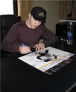 Boston Bruins Frank Vatrano has hand signed in blue on this 16x20 goal celebration photo during a private signing with Your Sports Memorabilia Store on December 13, 2015.