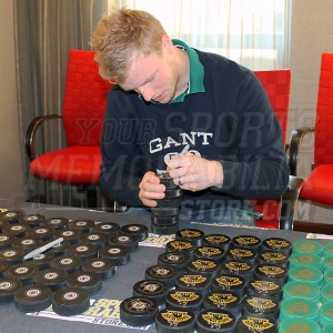 Carl Soderberg has hand signed in blue on this Team Sweden hockey puck during a private signing with Your Sports Memorabilia Store on November 16, 2014. Your Sports Memorabilia Store is proud to be the exclusive memorabilia provider for Carl Soderberg. Your Sports Memorabilia Store conducted the first post Stanley Cup signings with Captain Zdeno Chara, Brad Marchand, Johnny Boychuk, Patrice Bergeron, David Krejci, Adam McQuaid, Tomas Kaberle, Michael Ryder, Tuukka Rask, Andrew Ference & Rich Peverley. YSMS is proud to be exclusive memorabilia distributor for: Boston Bruins Brad Marchand, Patrice Bergeron, Zdeno Chara, David Krejci, Tuukka Rask, Johnny Boychuk, Gregory Campbell, Dennis Seidenberg, Chris Kelly, Torey Krug, Adam McQuaid, Loui Eriksson, Reilly Smith, Kevan Miller, Carl Soderberg, Matt Fraser, Seth Griffith and Ryan Spooner. Chris Kreider, Cam Talbot, Dan Boyle, Ryan Haggerty, Anthony Duclair and Chris Mueller of the New York Rangers YSMS watermark on item darkens it a bit, actual autograph item clearer. This item comes with a Carl Soderberg hologram, Your Sports Memorabilia Store hologram and certificate of authenticity with our unconditional lifetime guarantee.