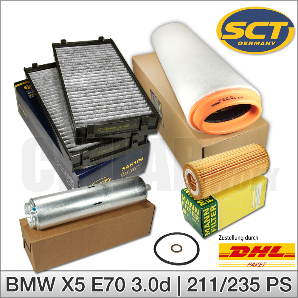 Inspektionskit für BMW X5 E70 3.0d Für Fahrzeuge mit 211 PS & 235 PS Lieferumfang: Innenraumfilterset mit Aktivkohle (SCT-Germany) Motor-Luftfilter (SCT-Germany) • tausendfach bewährter Filter aus dem Hause SCT Ölfilter (MANN) • Ölfilter Dieselfilter / Kraftstofffilter (hochwertiger Markenfilter nach Bestand) • garantiert 100% kompatibel und passgenau Wir liefern hochwertige Markenfilter