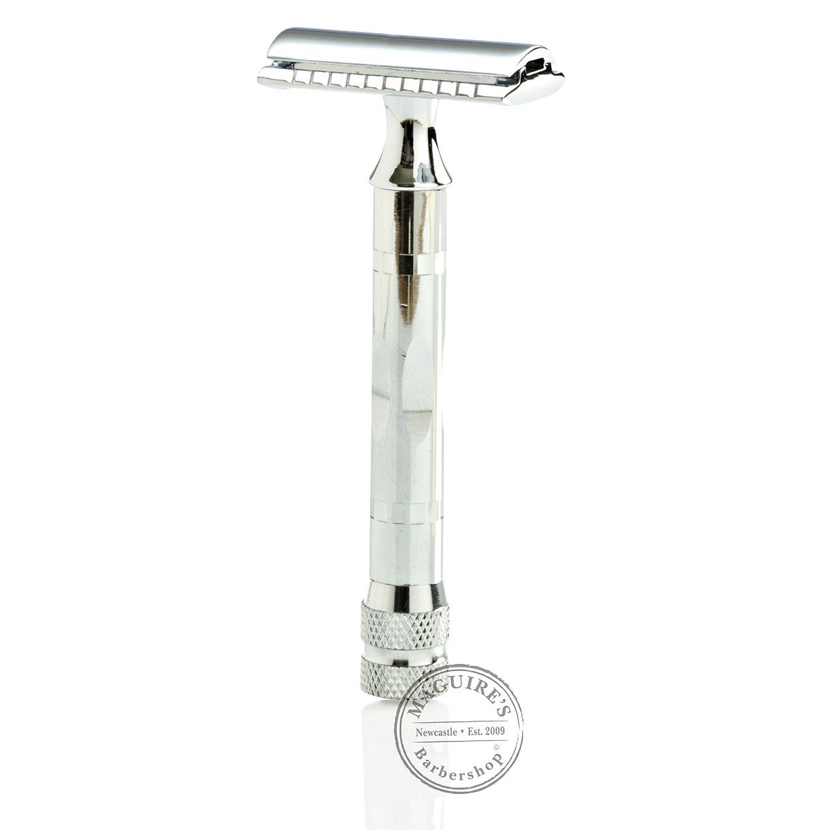 The Parker 89R Double Edge (DE) Safety Razor is a beautifully finished 3 piece razor. The handle is chromed brass with fine detailing along the main section, including angled collars, which not only offer a contrast to the polished chrome but also allow for a good grip even when hands are wet. The milled base flares out subtly, allowing for easy blade swapping and also adds the finishing touch to an eye catching razor. The razor sits comfortably in the hand. and the weight is evenly distributed along the length of the handle, achieving a well balanced easy to use razor. The handle is topped with a plated brass head which is finished in Polished Chrome. An elegant looking razor and a popular favourite.