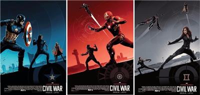 This is a set of 4 original promotional movie posters for the Movie CAPTAIN AMERICA CIVIL WAR (2016). These posters were exclusive to the AMC Theater Chain and only available at Sunday Imax 3D Screenings. This is the complete set.