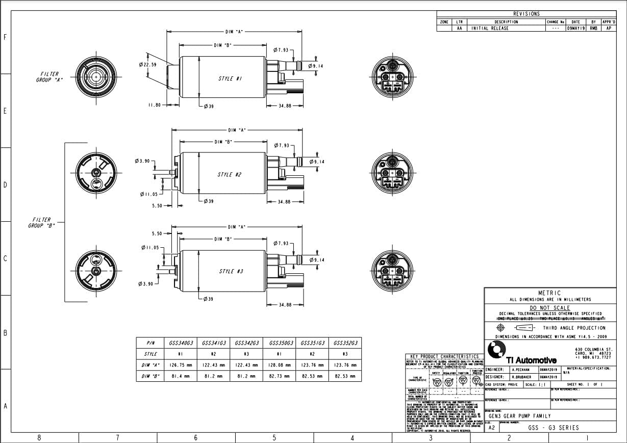 Also available are the GSS340 255lph pump (same specs, flow, diameter and fitment but center inlet), and the upgraded GSS352G3 350lph pumps .