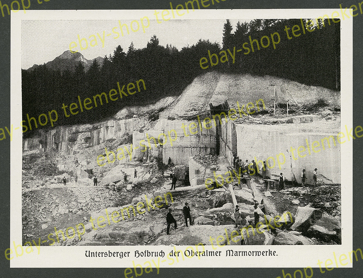 Zu Rückgabe und AGB bitte mich-Seite beachten. Die dort hinterlegten Informationen sind verbindlicher Bestandteil dieses Angebots/dieser Artikelbeschreibung!A-5411 Oberalm, Tennengau, Salzburg-Umgebung (SL), Gerichtsbezirk Salzburg, Glanegg, A-5082 Grödig, Glanegg (50314 003), Alpen, Berge, 19. Jahrhundert, 20. Jahrhundert, Abbautechnik, Adnet, Adneter Marmor, Alpen, Alte Berufe, Arbeit, Arbeiter, architecture, Architektur, Architekturgeschichte, Bau Steine Erden, Bauarbeiter, Baubranche, Baugeschäft, Baugeschichte, Baugewerbe, Baukörper, Baukunst, Baumaßnahme, Baumaterial, Baumethoden, Baustil, Baustoffe, Baustoffindustrie, Bauten, Bauunternehmen, Bauunternehmung, Bauwerk, Bauwesen, Bergbau, Berge, Beruf, Berufe, Berufsleben, Berufswelten, Berufswesen, Bezirk Hallein, Bildhauer, Bodenschätze, Branche, Branchen, Donaumonarchie, Doppelmonarchie, Felsblöcke, Felsen, Fördertechnik, Gebäude, Geologie, Gestaltung, Gestein, Gewerbe, Großstadt, Grundbau, Handwerk, Heimat, Heimatkunde, historical, historisch, Historische Bilder, history, Hoch- und Tiefbau, Hochbau, Hüttenwesen, K.u.K., Kaiserzeit, Kalkstein, Kultur, Kulturgeschichte, Kunst, Kunstgeschichte, Landesentwicklung, Landeskunde, landscape, Landschaft, Marmorsteinbruch, Mineralien, Mineralogie, mining industry, Naturstein, Nostalgia, Nostalgie, Ortsansichten, Ortsgeschichte, Ortskunde, Österreich, Österreichische Geschichte, Österreichische Wirtschaftsgeschichte, Österreich-Ungarn, Pferde, Pferdegespann, Pferdewagen, Politischer Bezirk Hallein, Produktion, Salzburg, Stein, Steinbruch, Steinmetz, Steinverarbeitung, Tagebau, Technik, Technikgeschichte, Topographie, Transport, Transportmittel, Wirtschaft, Wirtschaftsbetrieb, Wirtschaftsgeschichte, Zeitgeschehen, Zeitgeschichte Der Untersberger Marmor ist ein vielseitig verarbeiteter Kalkstein. Dessen Benennung mit dem Zusatz „Marmor“ verweist auf seine Verwendung als Bildhauer- und Dekorationsgestein, ist historisch geprägt und auch heute üblich, da dieser Kalkstein wie Marmor verarbeitet und poliert werden kann. Der Stein wird und wurde am Nordhang des Untersberges in den Nördlichen Kalkalpen bei Fürstenbrunn (Salzburg) gebrochen. Das Marmorwerk stellt eine Ortslage der Gemeinde Grödig dar, aufgelassene Abbaustellen ziehen sich bis nach Großgmain. Das Untersbergmuseum, das den Abbau dokumentiert, liegt nicht im heutigen Steinbruch selbst, sondern unterhalb in Fürstenbrunn. Geschichte Untersberger Marmor wurde bereits in der Römerzeit abgebaut. Im Veitlbruch, der seit 1919 nicht mehr betrieben wird, fand man in einer Abraumhalde steinerne Bruchstücke der Römer, die im Untersbergmuseum in Fürstenbrunn ausgestellt sind. Bis 1703 wurde der Steinbruch vom Erzbischöflichen Hofbauamt betrieben. Die Bischöfe und Adeligen, wie die von Baron Friedrich von Löwenstern, waren im Besitz der Steinbrüche, bevor die Marmorindustrie Kiefer AG (seinerzeit Kiefersfelden in Bayern, heute in Oberalm) sie kaufte. Im Jahre 1887 erwarb die Kiefer AG von Freiherr von Löwenstern die Steinbrüche des Untersberges und das Hauptwerk in Oberalm mitsamt den Adneter Marmorbrüchen. Die Steinbrüche, die erworben wurden, waren der Hofbruch, Neu-, Mittel- und Veitlbruch. Heute wird Untersberger Marmor nur noch in zwei Steinbrüchen abgebaut, im großen Kieferbruch47.7385212.990035575 und dem kleineren Mayr-Melnhof-Bruch oberhalb. Entstehung und Handelssorten Das Gestein ist in der Oberen Kreide entstanden. Kalksteine sind Sedimentgesteine (Ablagerungsgesteine). In diesem Kalkstein sind Bruchstücke von abgestorbenen Schnecken, Muscheln usw. aus Kalk abgelagert. Die sehr dichten Natursteine sind zusammengesetzt aus fein- bis vereinzelt grobkörnigen Kalkbruchstücken und -geröllen, die durch Calcit verkittet sind. Die Natursteinsorten im Untersberg variieren farblich von hell beige (mit roten Tupfen) bis rosa und rötlich, selten gelb. Handelsüblich ist der lichtgelbe Untersberger Hell, der Forellenstein wegen der roten Pünktchen auch Forellenmarmor genannt, der rötlich geäderte Untersberger Rosa sowie der Untersberger Gelb. Die Dichtigkeit und Festigkeit machen diesen Naturstein verwitterungsfest. Die Eindringungstiefe von Wasser beträgt nur einige Zehntelmillimeter. Er kann poliert werden. Er ist sehr gut für Steinbildhauerarbeiten geeignet, da er filigrane Ausarbeitungen ermöglicht. Untersberger Marmor war in der figürlichen Steinbildhauerei im 16. Jahrhundert in Mitteleuropa weit verbreitet. Gewinnung Bis um 1900 wurden Steine in traditioneller Keiltechnik mit Steinspaltwerkzeugen gewonnen, danach kamen Drahtseilsägen mit Spiraldraht zum Einsatz. Heute verwendet man zur Gewinnung der Kalksteine vorwiegend Diamant-Seilsägen und Kettenschrämmaschinen. Der Untersberger Marmor wird seit kurzem unterirdisch abgebaut. Der unterirdische Abbau hat in Italien beim Abbau des Carrara-Marmors eine jahrzehntelange Tradition. In Österreich bietet der Einsatz dieser Technik vor allem den Vorteil, dass der teilweise über 10 Meter hohe Abraum nicht kostenintensiv weggeräumt werden muss, ferner entsteht keine Beeinträchtigung des Landschaftsbildes und der entstehende Lärm dringt von unter Tage kaum nach draußen. Verwendung Zahlreiche Skulpturen wurden aus Untersberger Marmor geformt. Zahlreiche Steinbildhauer und Architekten verwendeten diesen Naturstein vor allem im 17. Jahrhundert, wie Johann Bernhard Fischer von Erlach und dessen Sohn Joseph Emanuel, Georg Raphael Donner und später Fritz Schaper, Edmund Hellmer, Joseph Uphues, Otto March, Wolfgang Wallner, und andere mehr. In der Gründerzeit wurde dieser Kalkstein für Baufassaden, Brunnen, Statuen, Treppenhäuser und Grabmale besonders in Österreich-Ungarn und Deutschland verwendet. Salzburger Dom Hauptfassade, erbaut 1614–1655 Dreifaltigkeitssäule (Pestsäule) in Wien, erbaut 1679–1693 (Hofbruch-Marmor) Mirabellgarten in Salzburg, zahlreiche figürliche Darstellungen und Balustraden Marmorschlössl in Bad Ischl Engelsstieg