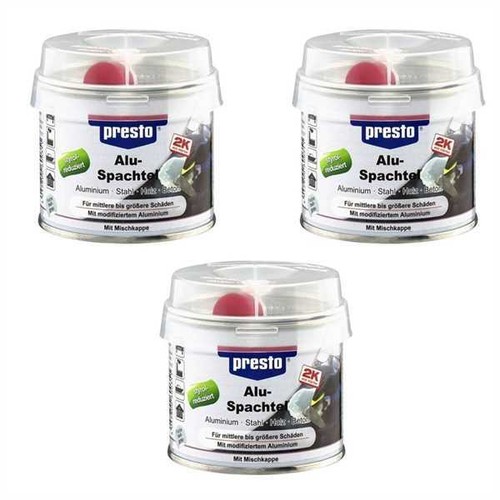 presto Alu-Spachtel ist ein zweikomponentiger Polyestermetallspachtel, als Mischung eines mittelelastischen, hochreaktiven, aminvorbeschleunigten Polyesterharzes mit verschiedenen umweltfreundlichen Füllstoffen und Aluminiumpigmenten.