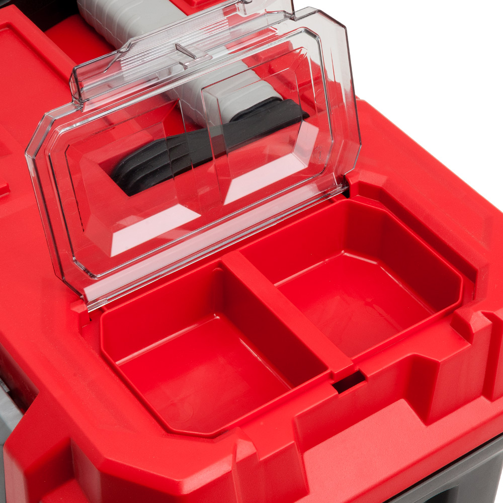 Im Deckel befinden sich verschließbare Fächer für Schrauben, Nägel oder andere Kleinteile. Durch die transparenten Verschlussdeckel behalten Sie immer den Überblick und finden die gewünschten Teile im Handumdrehen.
