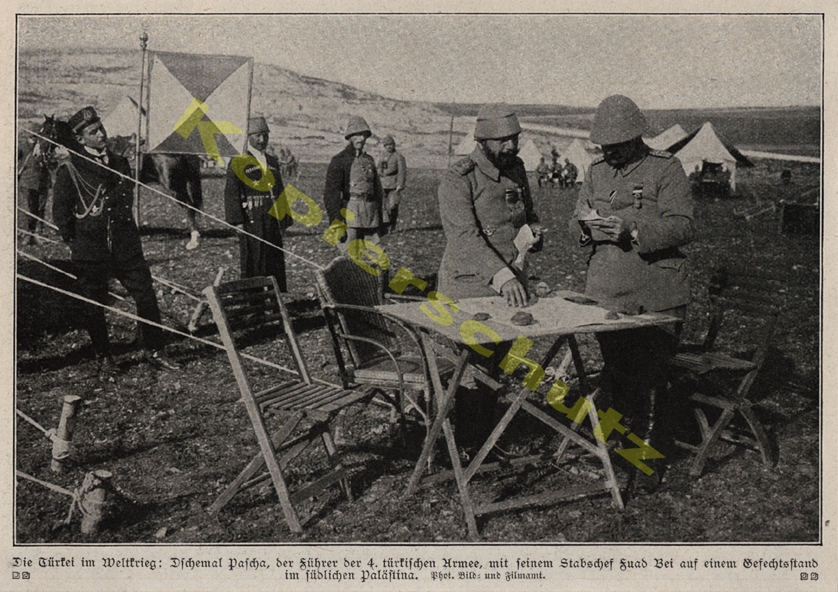 Zu Rückgabe und AGB bitte mich-Seite beachten. Die dort hinterlegten Informationen sind verbindlicher Bestandteil dieses Angebots/dieser Artikelbeschreibung!1. Weltkrieg, 1. Weltkrieg, 1. WK, 1.WK, 1917, 1st World War, 20. Jahrhundert, Arab world, Araber, Arabic, Arabien, arabisch, Arabische Halbinsel, Armee, Asien, Asienkorps, Asien-Korps, Der Europäische Krieg, Deutsche Geschichte, Deutsche Kolonialpolitik, deutsche Militärmission im Osmanischen Reich, Deutsche Orient-Mission, Deutsches Asien-Korps, Deutsches Kaiserreich, Deutsches Orient-Korps, Deutsches Reich, Deutschland, Deutsch-orientalische Beziehungen, Dimašq, DMG, Dschihad, Erster Weltkrieg, Ethnographie, Ethnologie, Fahne, Flagge, Front, Frontgeschehen, Geopolitik, German, German Empire, German-Turkish friendship, Germany, Glaubenskrieg, Halbmond, Heer, Heerführer, Heerwesen, Heiliger Krieg, Heiliger Oorlog, Heiliges Land, Heldenkampf, Heldenleben, Heldentaten, Heldentum, Historically, Historisch, Historische Bilder, history, Islam, Islamic, Jihad, jihad proclamation, Jihad Verkündigung, jihadization, Kaiserzeit, Kameradschaft, Kampf, Kampftruppe, Kleinasien, Kolonialpolitik, Krieg im Heiligen Land, Krieger, Kriegsbilder, Kriegs-Bilder, Kriegsfotografie, Kriegsführung, Kriegsgebiet, Kriegsgeschichte, Kriegsjahr 1917, Kriegskameraden, Kriegsland, Kriegsschauplatz, Kriegsschauplätze, Landeskunde, Landesverteidigung, Militär, Militärgeschichte, Militaria, military, Mohammedaner, Monarchie, Monarchy, Muslime, Muslims, Naher Osten, nostalgia, Nostalgie, Offizier, Offiziere, Opfergang, Orient, Orientalismus, Orientalistik, Ortsansichten, Ortsgeschichte, Ortskunde, Osmanen, osmanisch, Osmanischer Halbmond, Osmanisches Reich, Ottoman Army, Ottoman Empire, Ottoman jihad, Ottoman Palestine, Ottomanisches Reich, Palästina, Palästinafeldzug, Palästinafront, Palestine, Patriotismus, Politikgeschichte, Religionskrieg, religious duty, Sinai, Sinaifront, Sinai-Front, Sinai-Wüste, Soldat, Soldaten, Strategie, Sub-Saharan Africa, Syrian, Syrien, Taktik, Tapferkeit, Topographie, Transjordanien, Tropen, Truppe, Türkei, Türken, türkisch, Türkische Geschichte, türkische Heeresleitung, Türkisches Reich, Turkish, Türkiye, Uniform, Vaterland, Verbündete, Völkerkunde, Vorderasien, Vorderer Orient, Weltkrieg 1914-1918, Wilhelminische Ära, wilhelminische Epoche, wilhelminische Weltpolitik, Wilhelminisches Kaiserreich, Wilhelminisches Zeitalter, World War I, Wüste, Wüstengebiet, Wüstenkrieg, Wüstentruppe, WWI, Zeitgeschehen, Zeitgeschichte, دمشق, دمشق Dimaschq, Miṣr Das Bild- und Filmamt (Bufa) ist eine am 30. Januar 1917 von der Obersten Heeresleitung (OHL) gegründete Einrichtung zur Einbeziehung des Filmmediums in die psychologische Kriegführung. Entstanden ist das Bufa aus der am 1. November 1916 bei der Nachrichtenabteilung des Auswärtigen Amtes eingerichteten "Militärischen Film- und Fotostelle". Maßgeblicher Betreiber der Bufa-Gründung war der Leiter der Militärabteilung des Auswärtigen Amtes, Oberstleutnant Hans von Haeften, der auch die Leitung des neuen Amtes übernahm. Aufgaben und Arbeitsweise Die Aufgaben der Bufa, das alle regierungsamtlichen und militärischen Film- und Presseabteilungen - das Foto- und Filmzensurbüro, das Pressebüro des Generalstabs und das Filmbüro des Auswärtigen Amtes - vereinigte, bestanden u. a. in der Versorgung mit Filmen im Inland und an der Front, der Einrichtung von Feldkinos, der Heranziehung von Filmgesellschaften zu Produktionen im regierungsamtlichen Auftrag, der Verteilung des Rohfilmmaterials der AGFA und dem Vertrieb von Filmen im Ausland. Das Bufa setzte Kriegsberichterstatter ein, produzierte Filme und besaß sogar eine eigene Kopieranstalt. Obwohl verschiedene Privatfirmen wie die Oskar-Messter-Film GmbH in das Bufa eingegliedert wurden, unterlag seine gesamte Tätigkeit der Geheimhaltung. Filme des Bufa (Auswahl) Der Feldarzt (1917) Jan Vermeulen, der Müller aus Flandern (1917) Unsere Helden an der Somme (1917) Der papierene Peter (1917) Der magische Gürtel (1917) Dem Licht entgegen (1917/18) Kinderhände (1918) Gründung der Ufa Das Bufa wurde am 4. Juli 1917 durch Erich Ludendorff in die Universum Film AG (UFA) umgewandelt, aus der nach Ende des Zweiten Weltkrieges - neben einer Reihe westdeutscher Privatfirmen - wiederum die DEFA hervorging. Propagandastellen anderer Länder In Österreich war während des Ersten Weltkrieges das Kriegspressequartier für die Bild- und Filmpropaganda zuständig, in Frankreich das Maison de la Presse, in Großbritannien das War Propaganda Bureau und in den USA das Committee on Public Information. Ahmet Cemal (ältere Transkription: Ahmed Djemal), bekannt als Cemal Pascha (* 6. Mai 1872 in Mytilini auf Lesbos; † 21. Juli 1922 in Tiflis, Georgien), war jungtürkischer Nationalist, General (Pascha) und führendes Regierungsmitglied des Osmanischen Reichs. Herkunft und Aufstieg Ahmet Cemal wurde in Midilli auf der Insel Lesbos als Sohn eines Militärarztes geboren. Von Kind an war ihm die militärische bzw. militärärztliche Laufbahn vorgegeben; er promovierte als Chirurg. Als junger Offizier schloss er sich der jungtürkischen Bewegung an und war gemeinsam mit Ziya Gökalp und Mehmet Talaat Gründer des Komitees für Einheit und Fortschritt. Ziel dieser Partei war die Übernahme der Regierung durch die Jungtürken und die grundlegende Erneuerung des türkischen Staatswesens. Als führendes Mitglied im Komitee für Einheit und Fortschritt übernahm Ahmet Cemal die politische Aufgabe, den Einfluss der jungtürkischen Bewegung im türkischen Offizierscorps zu stärken. Jungtürkische Revolution Unter der Führung des charismatischen Ismail Enver kam es 1908 in Thessaloniki zur offenen militärischen Rebellion der Jungtürken. Ahmet Cemal hatte großen Anteil daran, dass sich viele Offiziere und Mannschaften dem Aufstand anschlossen, was letztlich entscheidend für den Erfolg der Jungtürkischen Revolution war. Die milit