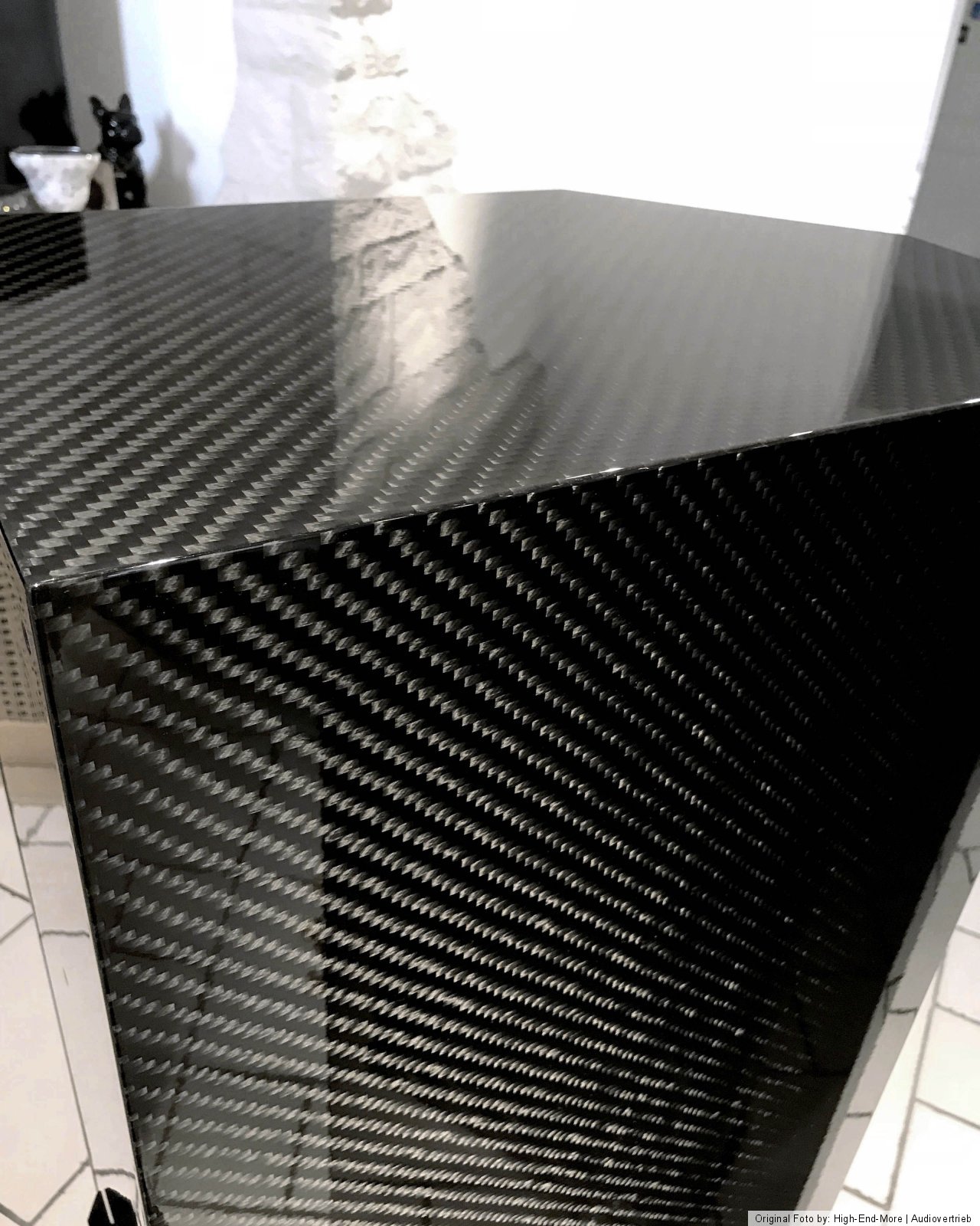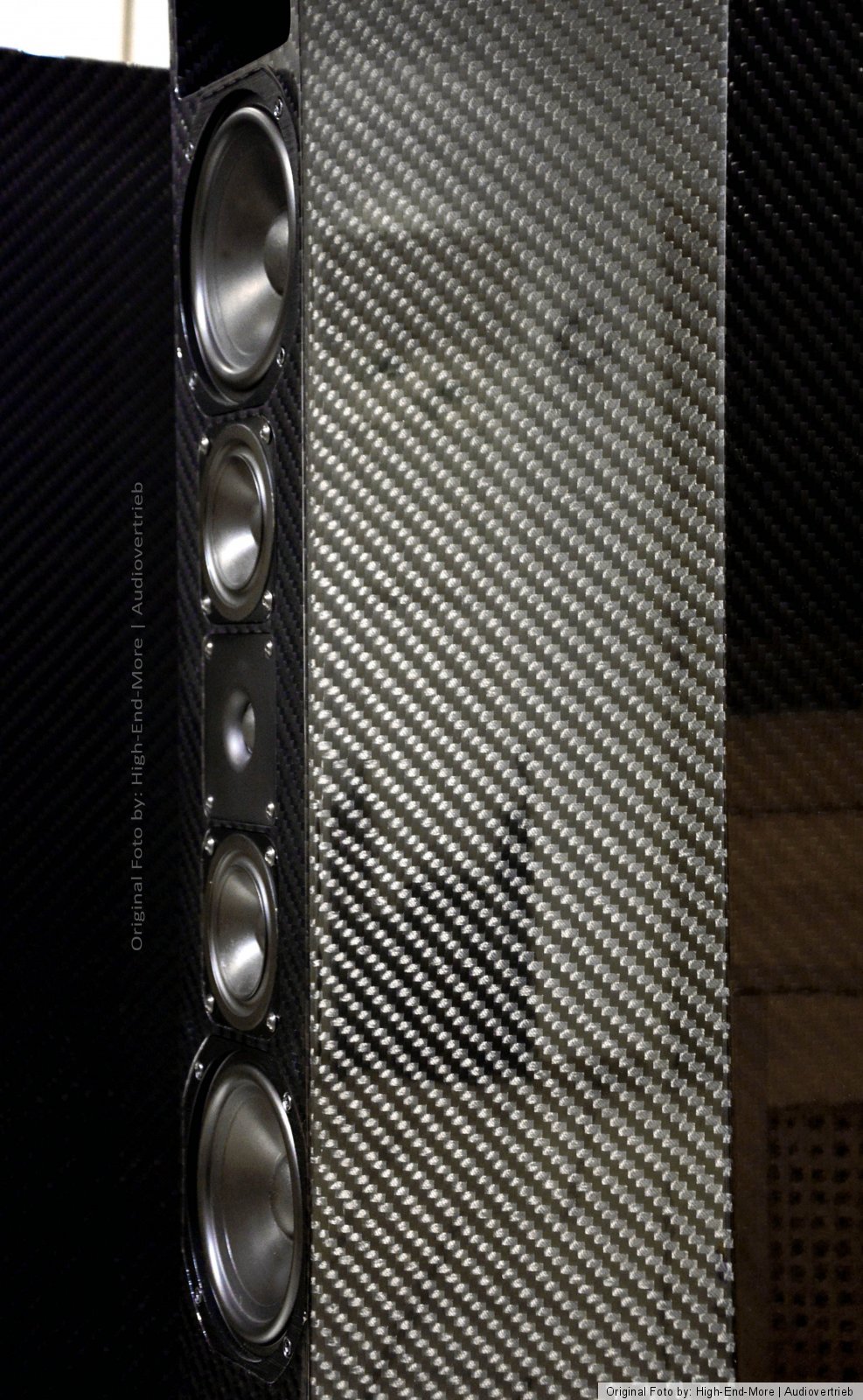 Für die Veredelung der Lautsprechergehäuse wurde echte 3D Carbon-Faser, mit grober 400gr/m² Struktur gesetzt. Bei dem Verlauf der Carbon-Faser wurde stets auf Gleichheit der Übergänge geachtet sowie bei den Basskanälen innen! In diesem Zuge wurde auch auf rechte Seite und Linke Seite der Lautsprecher geachtet, so das die Symmetrie im Raum zu einander passen. Allein dieser Part ist mit Worten nicht zu beschreiben... im weiteren Verlauf folgen dann noch unzählige Gänge mit speziellem Harz und Lack, verbunden mit unendlichen Schleiforgien und Kilometerlangen Schleifpapier verbrauch sowie sehr sehr viel Geduld!