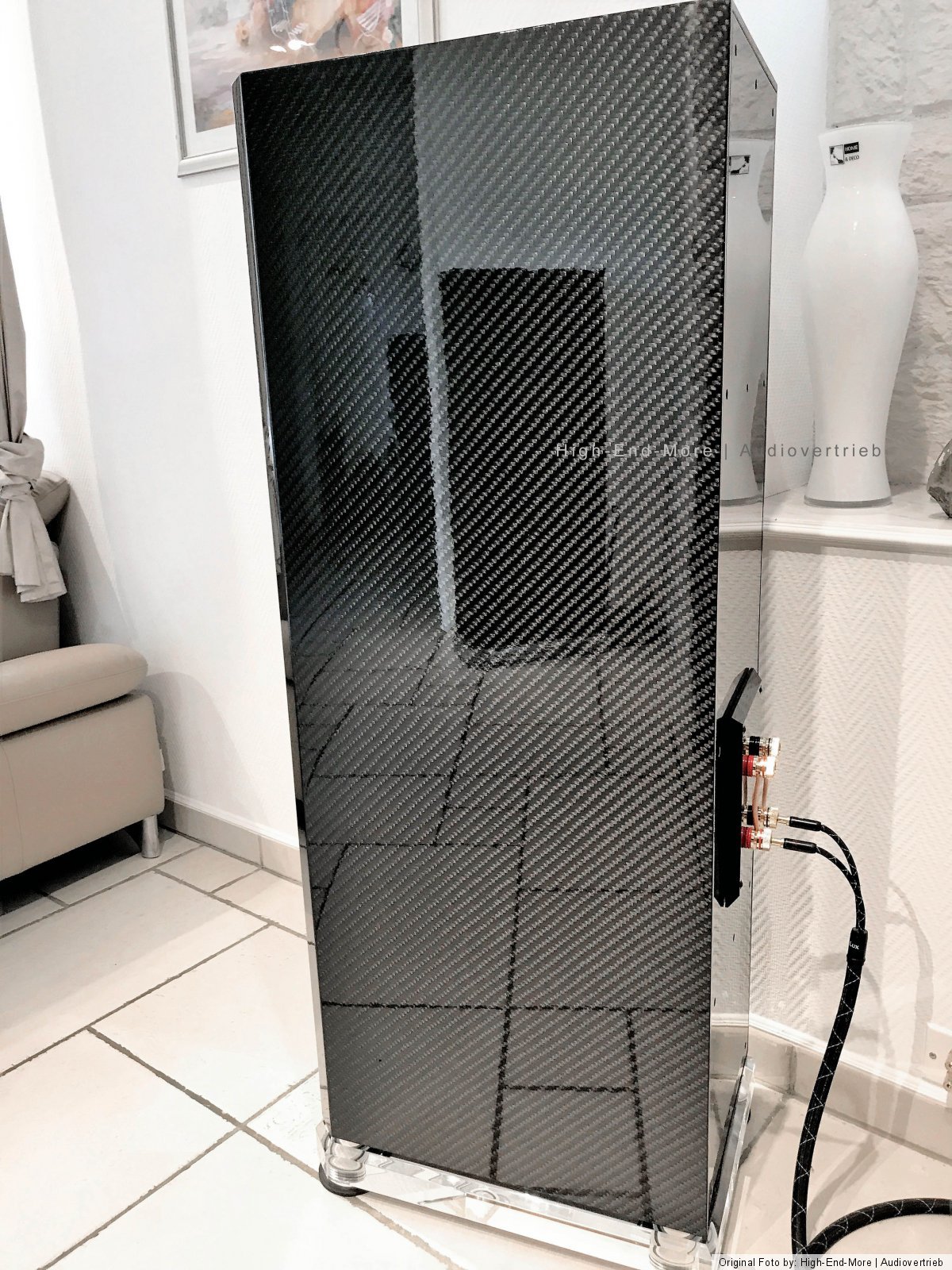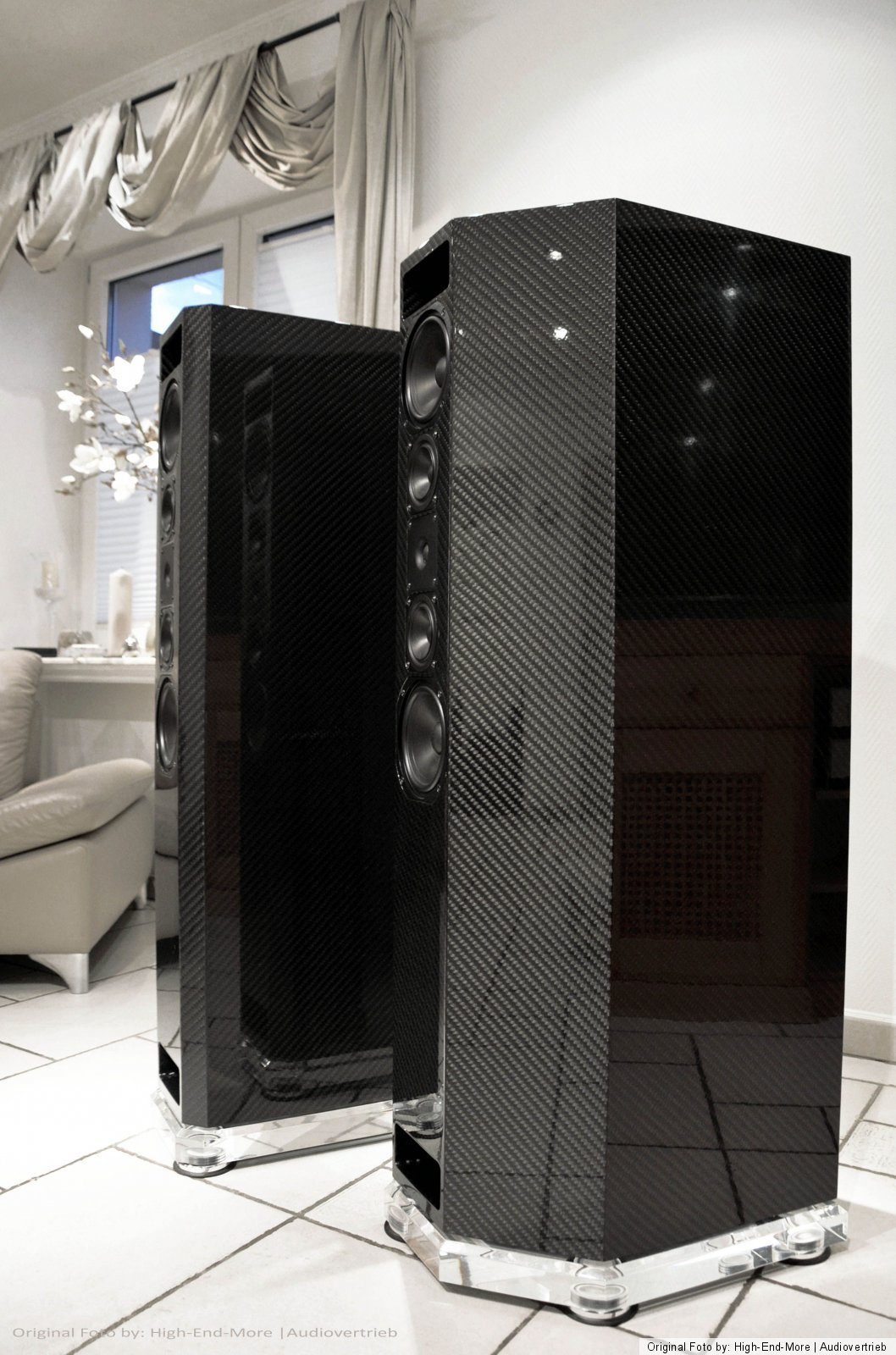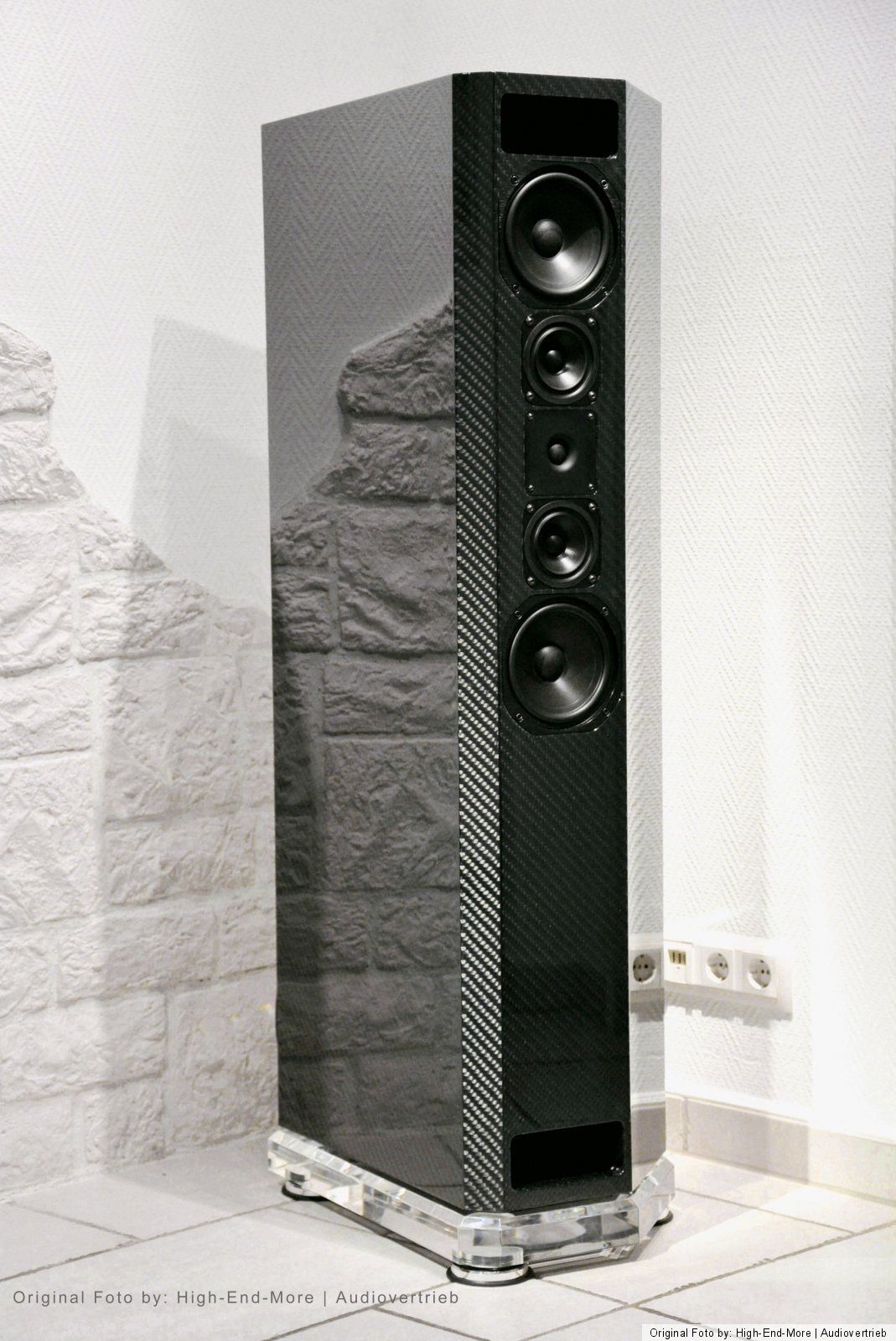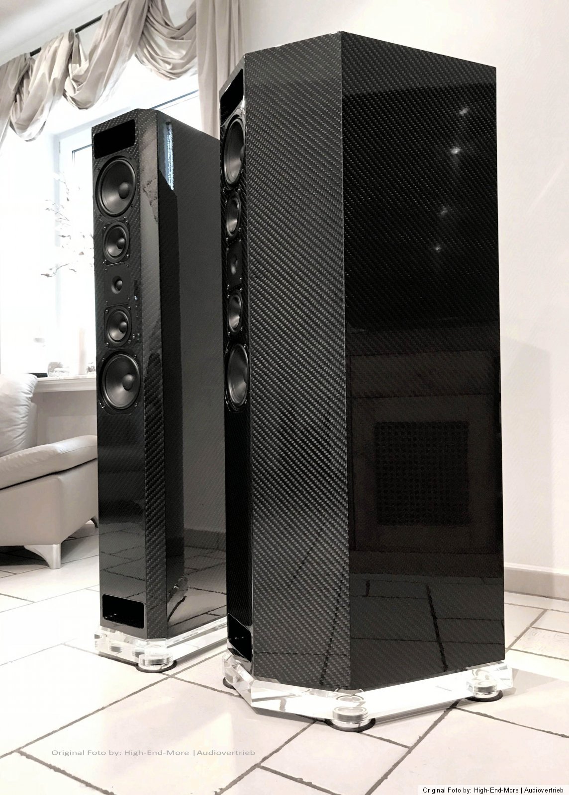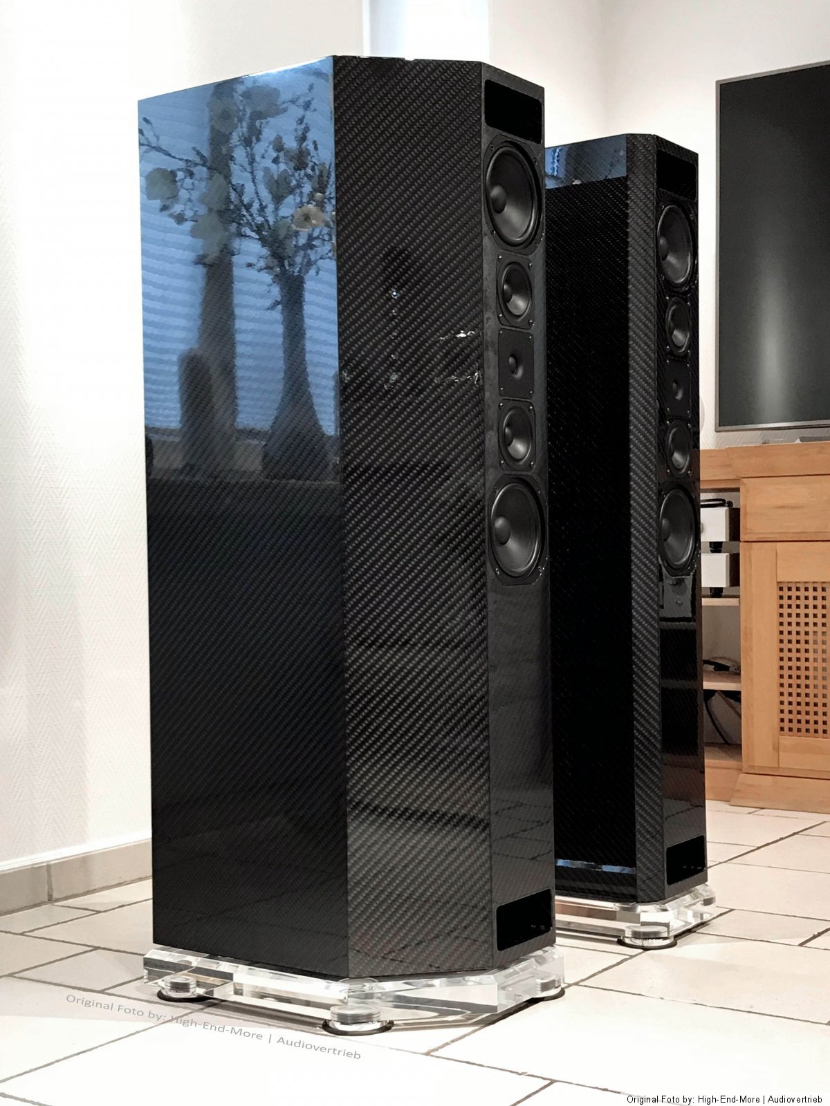 Der Technische Aufbau dieser Lautsprecher ist ein Doppelbandpaß-System, einfach Ventiliert und hochpassgefiltert. Trennfrequenzen sind 120/800/4000 Hz. Lautsprecher Chassis: Bass: 2 x 320mm | Tief-Mittelton: 2 x 180 mm | Mittelton 2 x 100 mm | Hochton: 1x 25 mm | Impedanz: 4 Ohm / kann bei hoher Last auch auf 2 Ohm herabfallen! Leistung: Sinus 450 Watt / Musik 780 Watt | Maße: Höhe (ohne Sockel) 1270 mm | Breite: 348 mm | Tiefe: 520 cm | Gewicht: 108 Kg Per Stück! Ausführung: Exklusiv-Carbon Veredelung in 3D Optik Hochglanzversiegelung | Standfüße /Sockel: GS - Acrylglas 60 mm > Formangepasst mit Diamantschliff sowie eingelassene Spezialabsorber / Spezial angefertigte Spikes im / V4 A auf Anfrage Optional erhältlich.