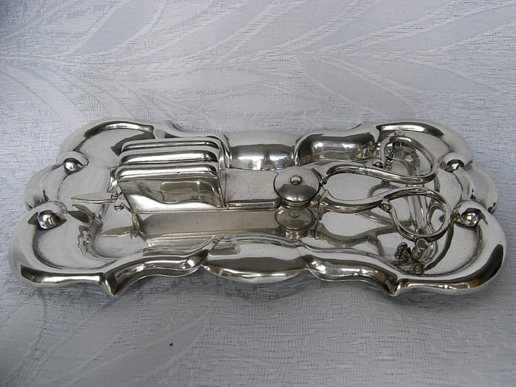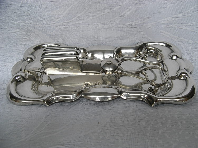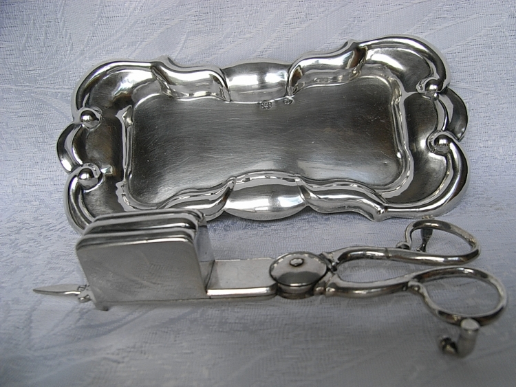Ein sehr schönes seltenes Lichtputzset, bestehend aus Lichtputzschere und Tablett, aus massivem Silber, 13-Loth gestempelt. Original aus der Zeit Wien um 1845, Meistermarke „ JL“ für JOHANN LECHNER. Keine Dellen, Top Zustand! Länge: 18,5cm / 14,2cm, Gewicht 195 Gramm, reich verziert, keine Reparaturen. Exquisite Anfertigung. Ein wirklich außergewöhnliches schönes Stück.