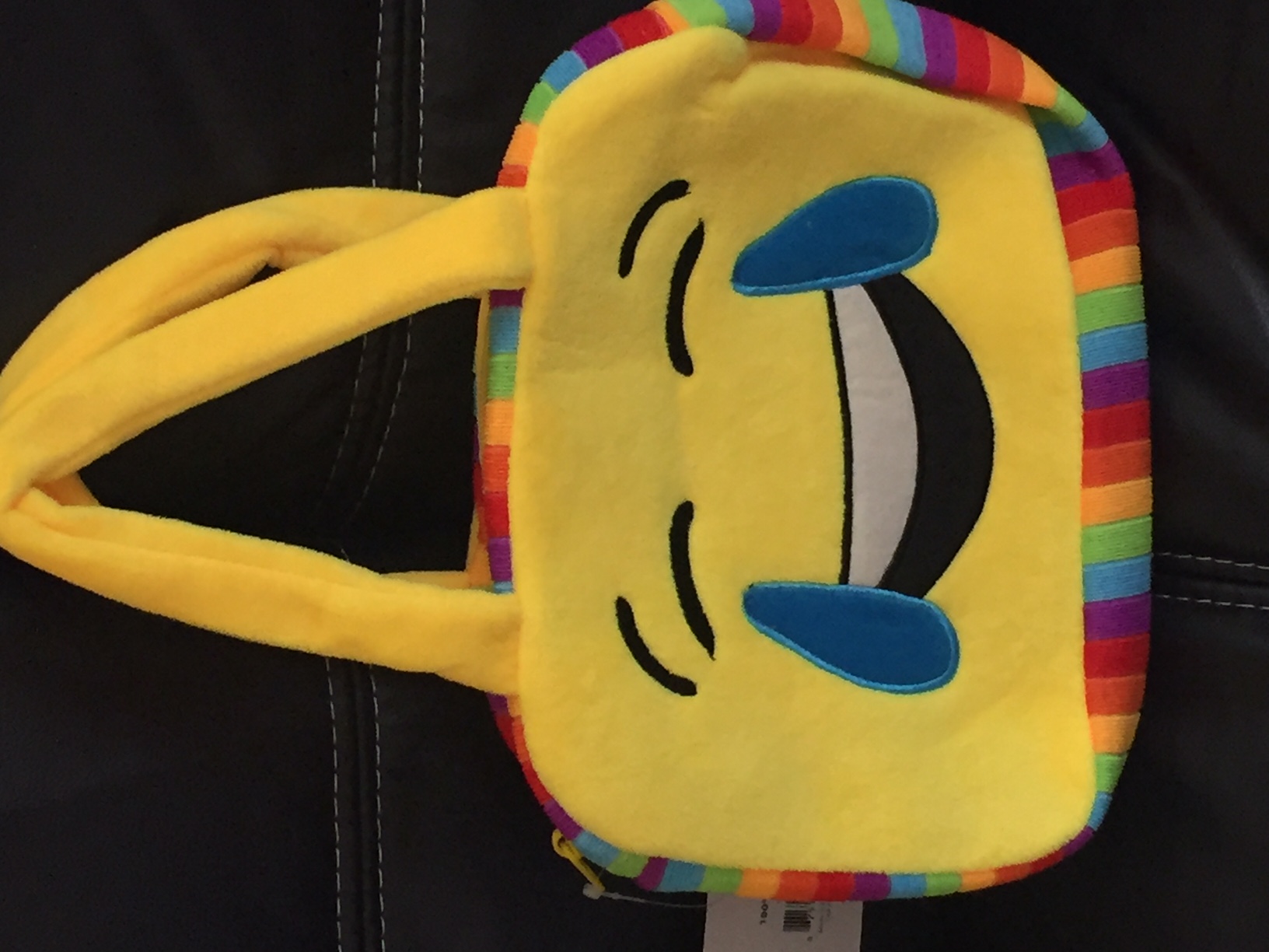 Polyester Smiley Bags are in Round and Rectangle Shapes with Zipper Closure. The Bags are in Yellow Color with Rainbow trim all around.