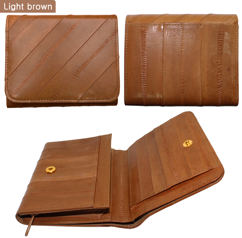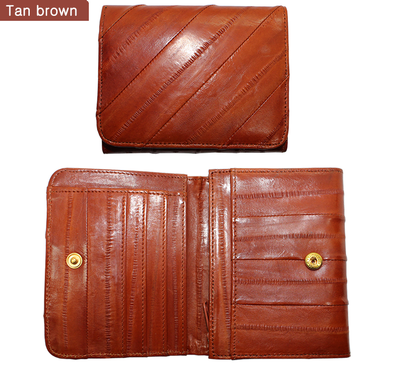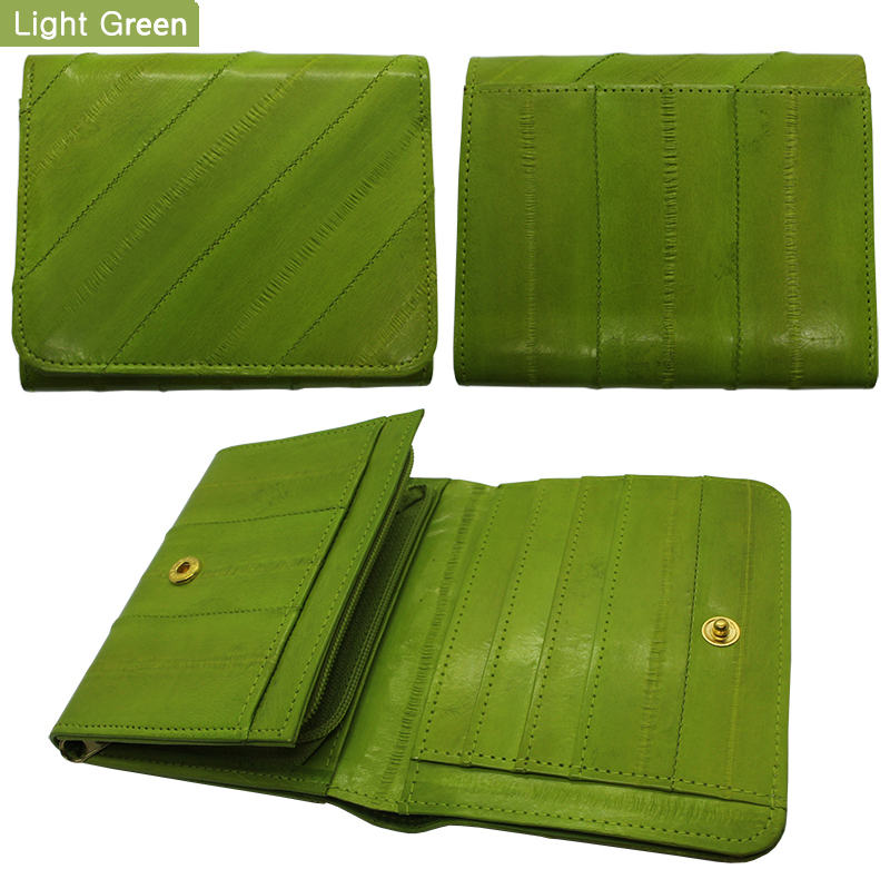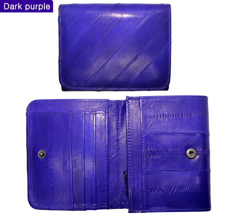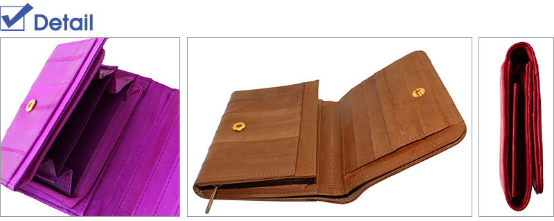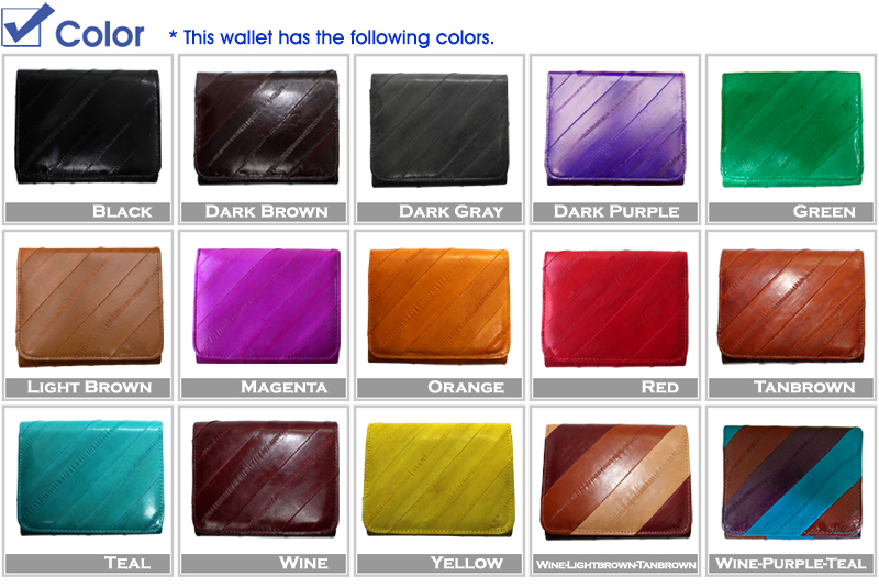 | Genuine Eel Skin Leather Coin Credit Card Wallet Purse * Material : Genuine Eel Skin Leather * Size : 4.33 x 3.54 x 0.87 inch (11 x 9 x 2.2 cm) * Colors; Black, Dark Brown, Dark Gray, Dark Purple, Green, Light Brown, Light Green, Magenta, Orange, Red, Tanbrown, Teal, Wine, Yellow, Wine-Lightbrown-Tanbrown, Wine-Purple-Teal * 3 Credit Card Slots * 1 Bill Compartment * 3 Slots * Inside zippered coin pocket 1 * Outside open slot 1 * Button Snap Closure # The lining of wallet can differ in product. # Product color can be different in dye process. # Colors may seem different depending on monitor resolution. # Genuine eel skin features; 1) Eel skin products dislike water. Please avoid the water. 2) If eel skin products stained with water, dry in the shade. 3) Eel skin products color is nice as use for a long time. 4) Surface finish and color can be erratic by handmade products. 5) A scratch and bites on surface of products is the proof of the genuine eel skin. |