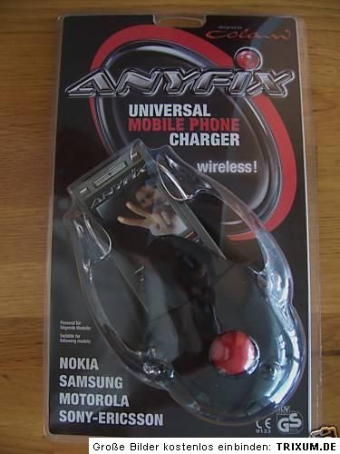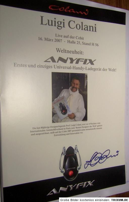 Luigi Colani persönlich entwickelte 2006 das atemberaubende Design des ersten Universalhandyladegerätes der Welt, des Anyfix. Beim Anyfix handelt es sich vermutlich um die oder eine der letzten epocheweisenden Arbeiten des mittlerweile 80jährigen Luigi Colani