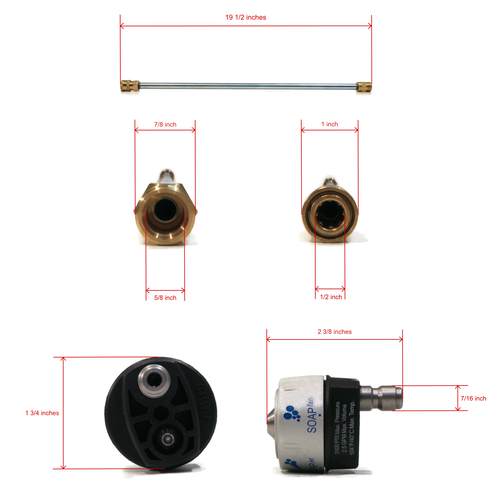 • Specs - Spray Gun - Inlet: M22 male. Outlet: M22 female. Max PSI: 3000. Max Temp: 140° F (60° C). Max GPM: 7. Wand - Male Pipe Thread Inlet: M22. Female Quick-Connect Outlet: 1/4". Max GPM: 10.5. Max PSI: 4000. Max Temp: 300° F (150° C). Hose - Length: 35'. End Types: M22 Female, Threaded. Diameter: 1/4" (6mm). Max PSI: 3200. Nozzle - Max PSI: 3100. Max GPM: 2.5. Max Temp: 104°F (40°C). Connection Type: 1/4" Male Quick-Connect. Refer to images 2 & 3 for more information