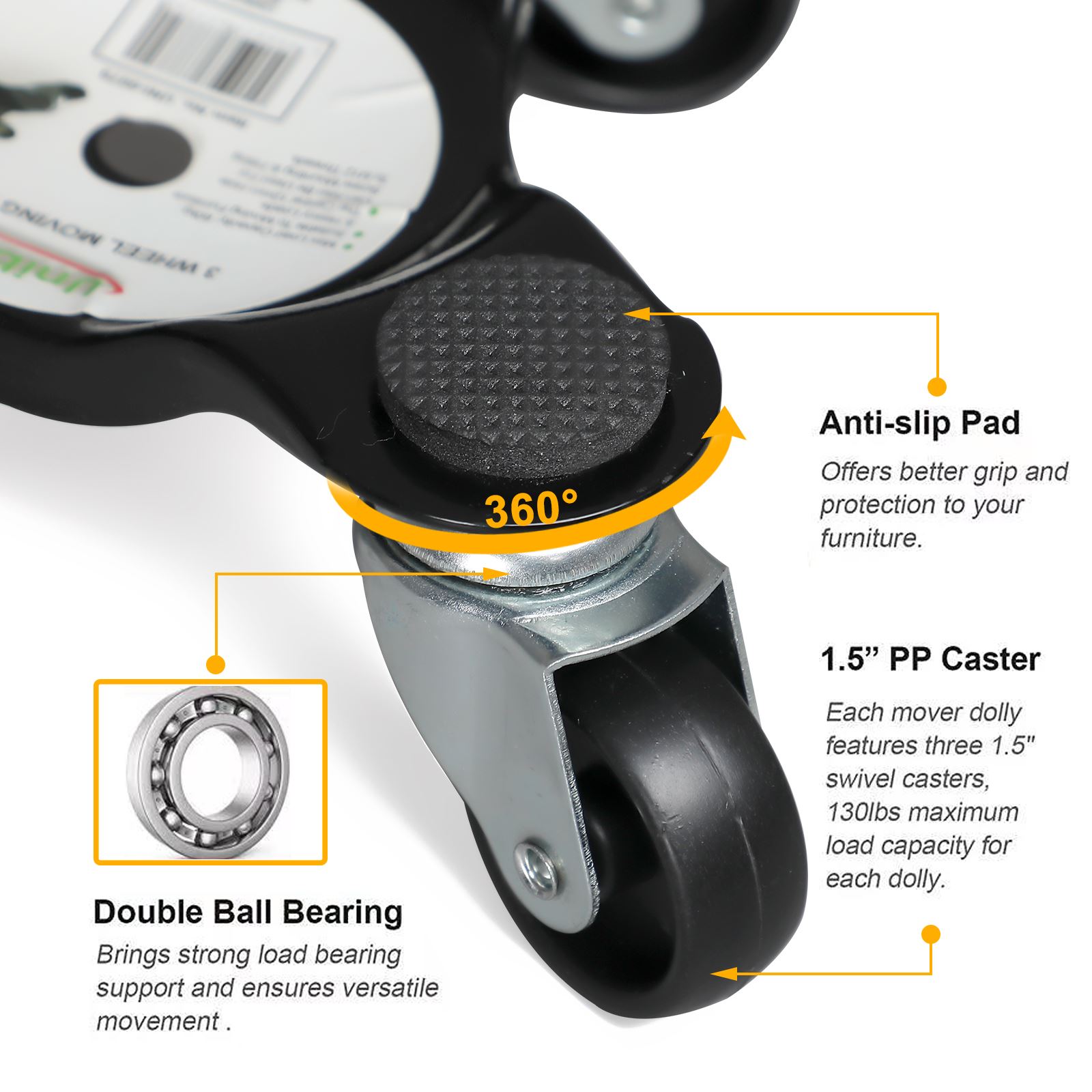 - 360° SWIVEL CASTER: 1.5 inches ageing resistance polypropylene caster with 360°rotation top plate, easily transform to any directions that you want, enable you spend little strength to move furniture safely with furniture moving rollers