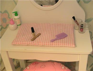 includes a lovely white vanity with mirror and a stool with removeable pad. I added a padded mat for the top of the vanity and some accessories, like lotion bottles, nail file nail polish clear containers etc.