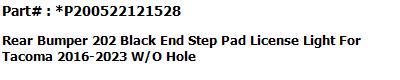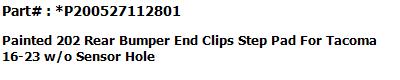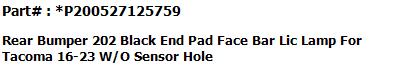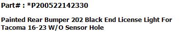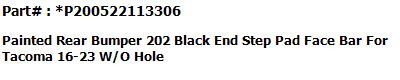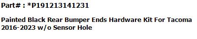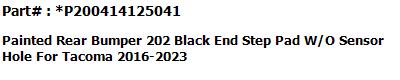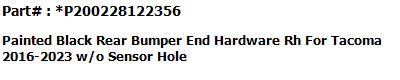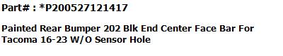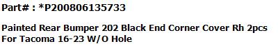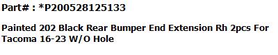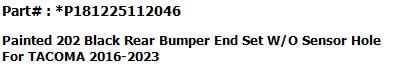 This is a Brand New replacement parts for For TOYOTA TACOMA 2016-2023 REAR BUMPER END PAINTED 202 BLACK W/O SENSOR HOLE RH=PASSENGER SIDE