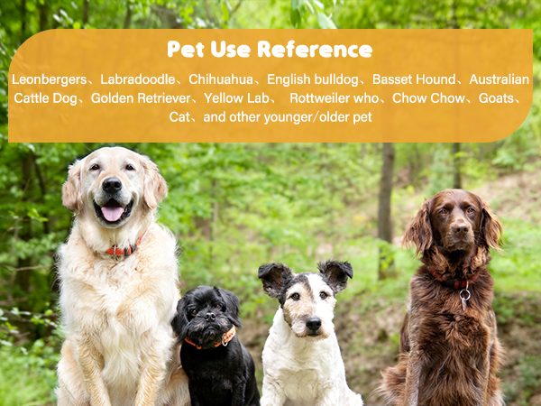 Leonbergers、Labradoodle、Chihuahua、English bulldog、Basset Hound、Australian Cattle Dog、Golden Retriever、Yellow Lab、Rottweiler who、Chow Chow、Goats、Cat、and other younger/older pet.