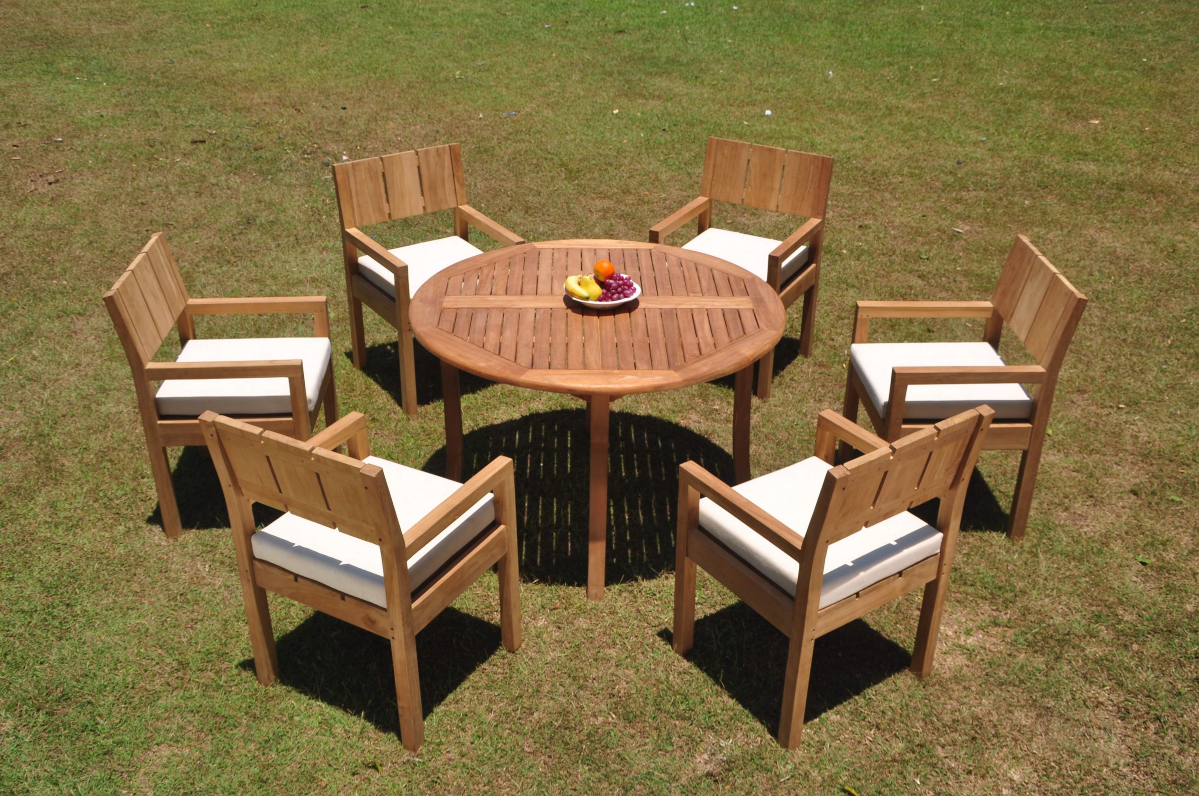 Set includes: 48" Round Table and 6 Veranda Arm Chair. Pictures shown with more chairs is for illustration purpose only. You will receive only 6 chairs. ** Wood Umbrella Hole Plug is also provided. ** 2" Umbrella Hole is available in the middle of the table. ** Umbrella is not included with the set, but can be purchase separately, please inquire. ** DON'T FORGET TO ENQUIRE ABOUT OUR SUNBRELLA CUSHIONS (SOLD SEPARATELY) ** If you need more chairs, please let us know. ** Assembly: Very little assembly is required. This furniture will be delivered in partially assembled sections. Assembly is quick and simple. **Accessories shown in picture are not included with the set. Please inquire if you are interested.