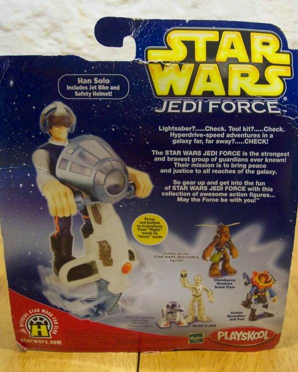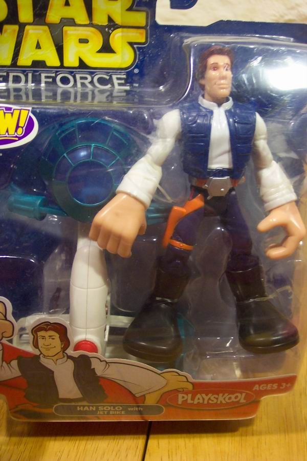 This is a Star Wars HAN SOLO W/ JET BIKE Action Toy. Made by Playskool. It is NEW in the box. Box has a little bit of wear. It is about 6 inches tall. Ages 3+ Great for a child's first Star Wars Toy. Nice Big Action Figure. Combine auctions to save on shipping. Winning bidder to e-mail within 3-days and payment to be received within 10-days.