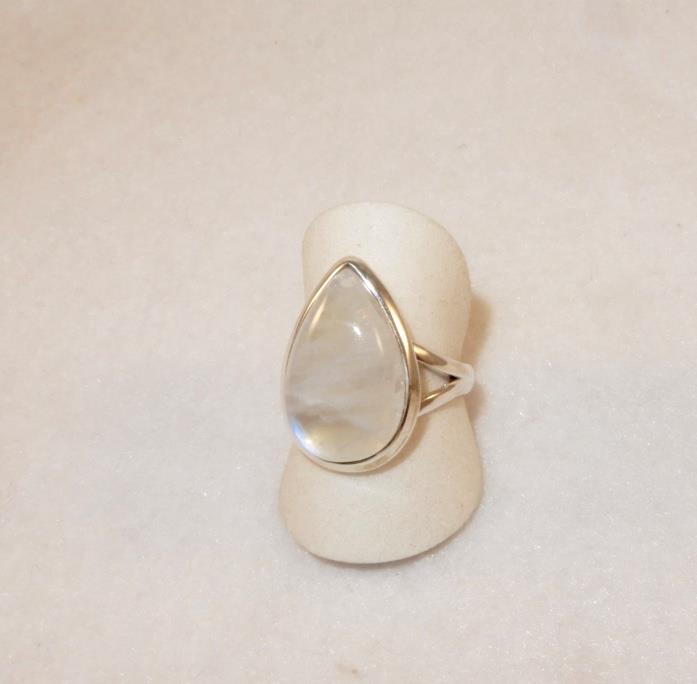 This flashy Rainbow Moonstone is made of 925 sterling silver and is a size 7.75. The stone measures 1/2 inch (12 mm) across and 3/4 inch (18 mm) down.