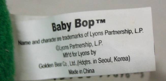 | This is a Barney LITTLE GREEN "Barney's Colorful World" BABY BOP DINOSAUR Plush Stuffed Animal Toy. Made by Lyons. It is 7 1/2 inches tall. It is in Great Condition. It is CLEAN! No Stains, Tears, or Defects. Combine auctions to save on shipping. Please contact me if you need to make other payment arrangements. AG ~~~~~~~~~~~SMOKE FREE HOME!!~~~~~~~~~~~