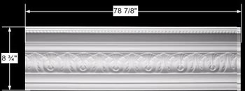 Cornices: Made of virtually indestructible high-density urethane our cornice is cast from steel molds guaranteeing the highest quality on the market. High-precision steel molds provide a higher quality pattern consistency, design clarity & overall strength & durability. Lightweight they are easily installed with no special skills. Unlike plaster or wood urethane is resistant to cracking, warping or peeling. Factory-primed our cornice is ready for finishing. Samples available. Measures 8 3/4 in. H x 78 7/8 in. L.