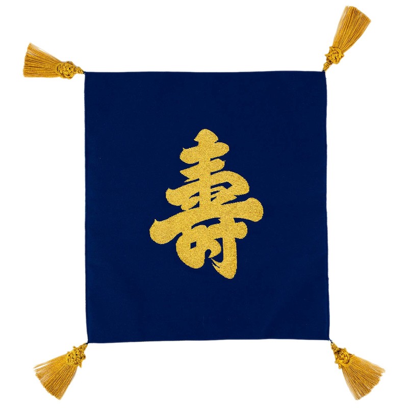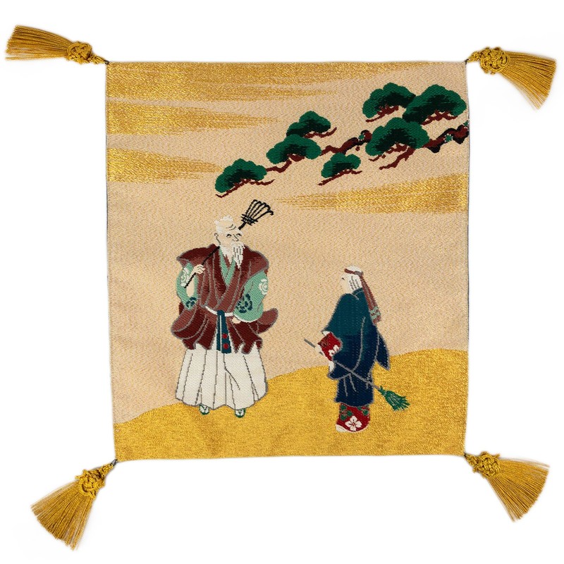 It is made of silk Nishijin Suzure-Ori brocade depicting an old man and woman (representing longevity) on one side and a large golden Kotobuki character on the other. It is sewn like an unstuffed cushion and has stiff gold tassels on the corners woven into tortoises which also represent a long life. It has probably never been used and is in perfect condition in its original kiri-wood box.