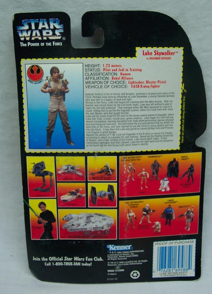 This is a Star Wars Power Of The Force LUKE SKYWALKER IN DAGOBAH FATIGUES Action Figure Toy. Made by Hasbro in 1995. It is NEW in the package. The package an bubble does have some wearc creases, and dents. It is about 3 1/2 inches tall. Ages 4+. Would make a Nice 100% Mint unplayed with figure to take out and use as a display piece. Combine auctions to save on shipping. EAG