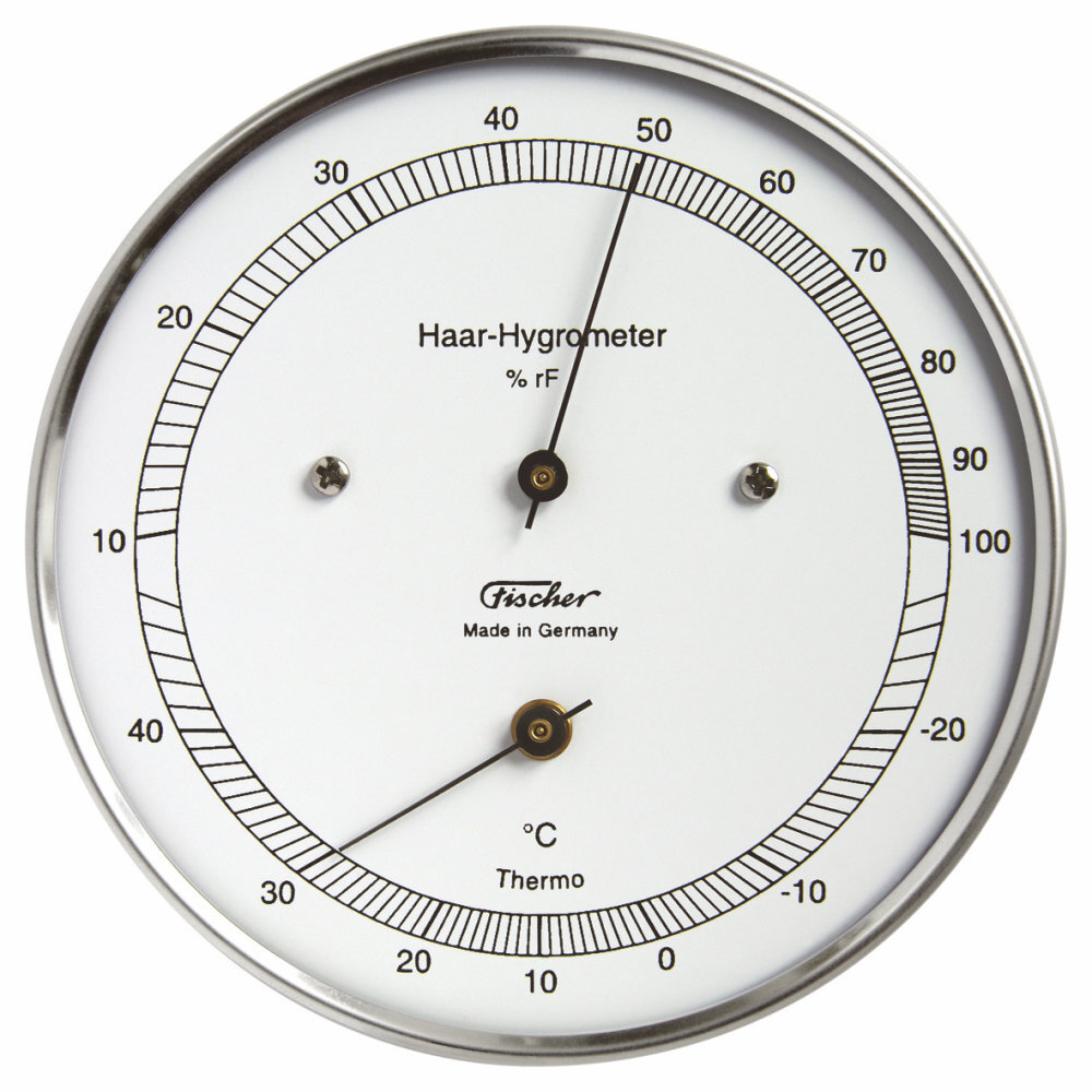 | Hair hygrometer with thermometer, stainless steel [Fischer 111.01T] New & Original Box For outdoor measurements and in high humidity hair hygrometer are preferable. The specially treated human hair of the Fischer hair hygrometer 111.01 is insensitive to temperature (temperature range -35 to +65 °C) and responds quickly to changes in humidity. Measuring range 0 to 100% relative humidity Measuring accuracyhygrometer: ± 3% RH (20 ... 100%), scale 1% RH Measuring accuracy thermometer: ± 1 K, + 1 scale division Stainless steel case. Diameter 103 mm.