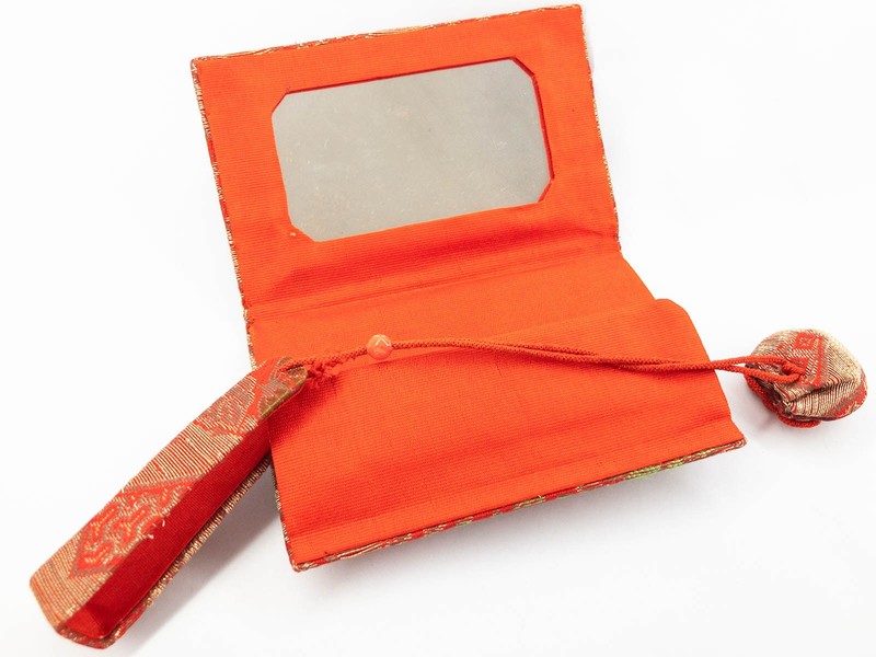 This one measures 4” X 2½” (10X6cm) and includes the following features: A closure ring with charm, an internal flap pocket and mirror and a metal Kanazashi with matching case and tassel - one of the 8 hanging chains on the kanzashi is partially missing.