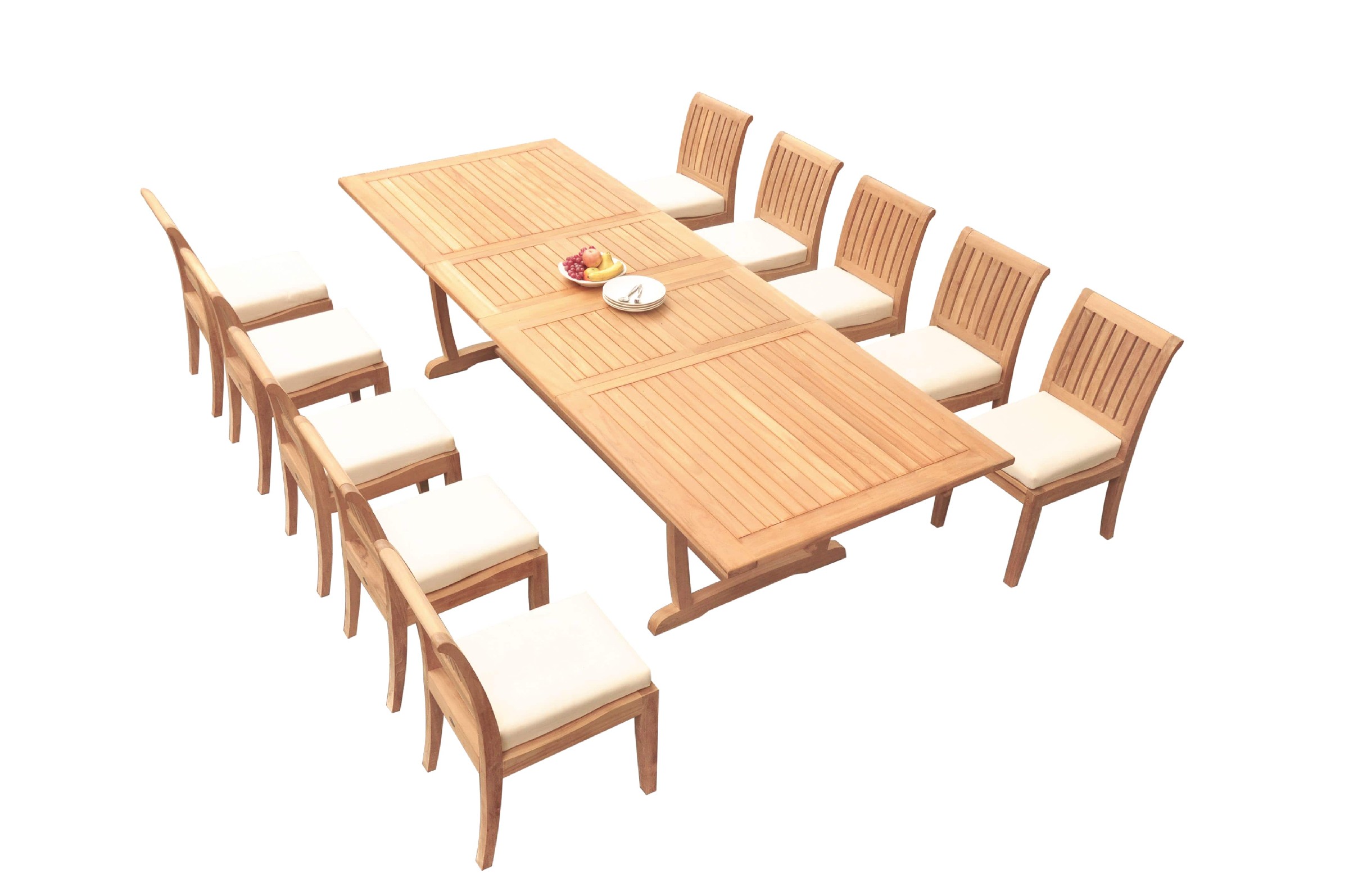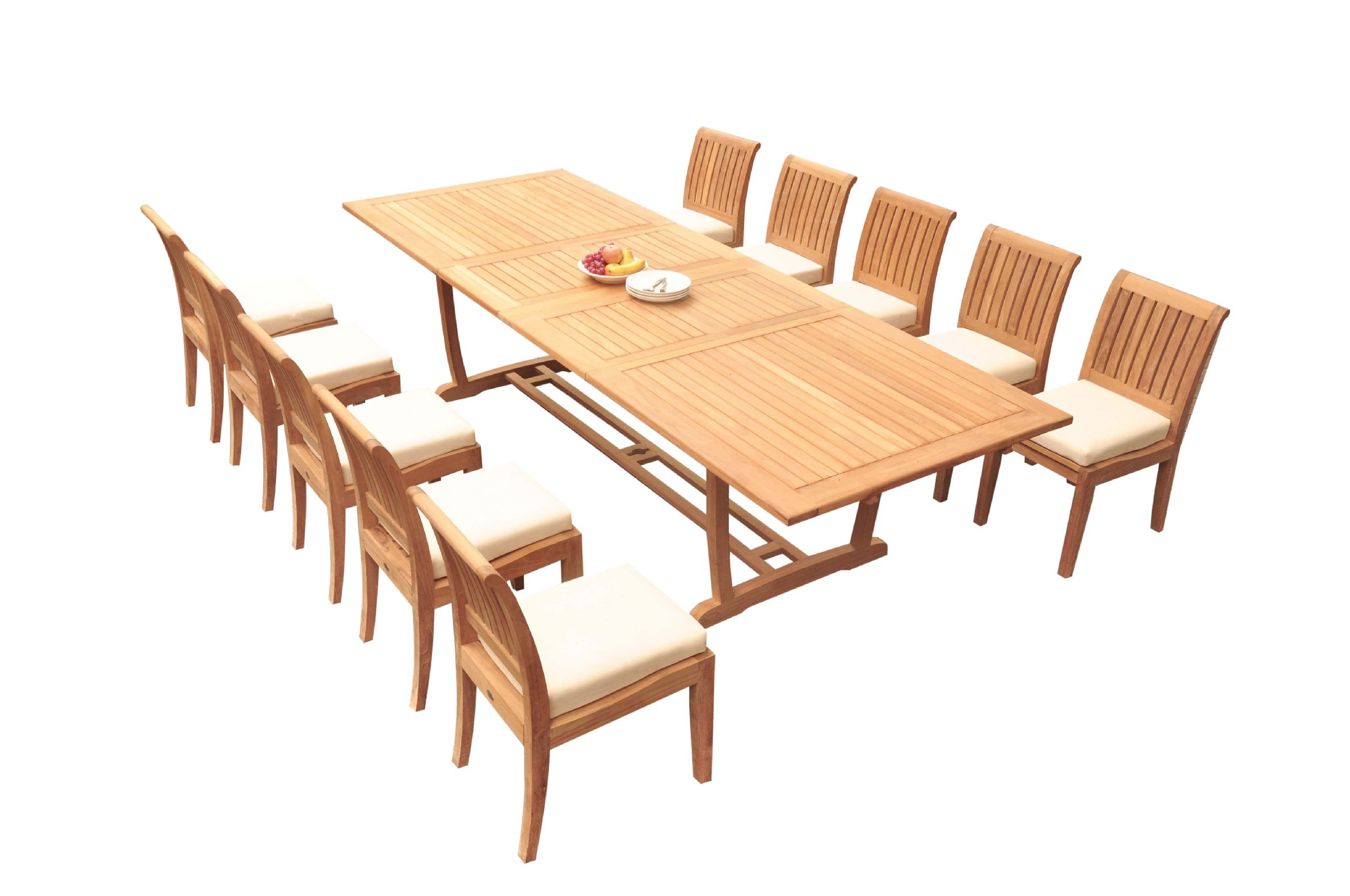 Set includes: 118" Double Extension Mas Rectangle Trestle Leg Table and 10 Lagos Armless Chairs. Pictures shown with more chairs is for illustration purpose only. You will receive only 10 chairs. ** Wood Umbrella Hole Plug is also provided. ** 2" Umbrella Hole is available in the middle of the table. ** Umbrella is not included with the set, but can be purchase separately, please inquire. ** DON'T FORGET TO ENQUIRE ABOUT OUR SUNBRELLA CUSHIONS (SOLD SEPARATELY) ** If you need more chairs, please let us know. ** Assembly: Very little assembly is required. This furniture will be delivered in partially assembled sections. Assembly is quick and simple. **Accessories shown in picture are not included with the set. Please inquire if you are interested.