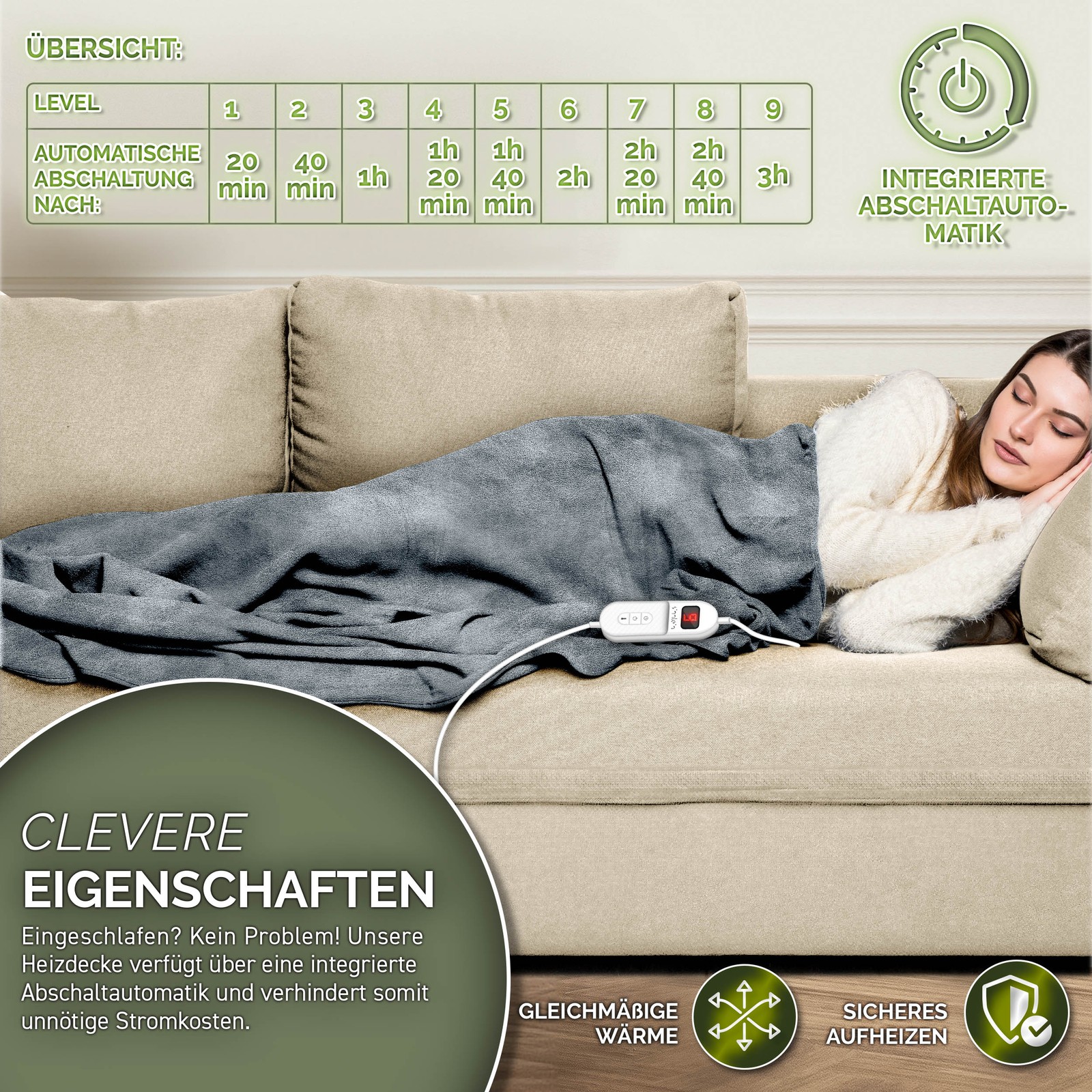 Die Decke verfügt über 9 einstellbare Temperaturstufen, eine Abschaltautomatik und einen abnehmbaren LCD-Regler, mit dem die Temperatur zwischen 35°C, 40°C und 45°C eingestellt werden kann.