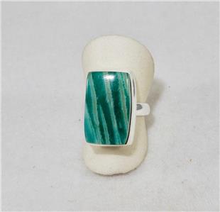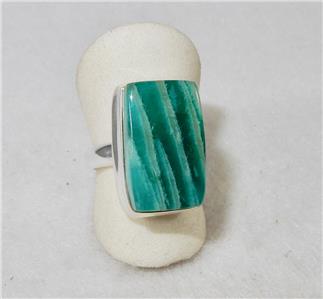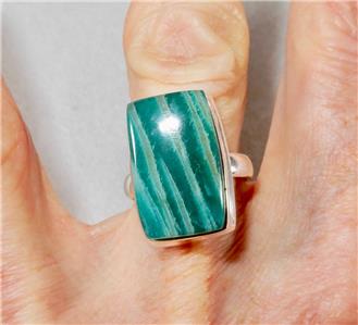 This beautiful amazonite ring is set in 925 sterling silver and is a size 7.25. The stone measures 3/8 inch (11 mm) in width and 3/4 inch (18 mm) in length.