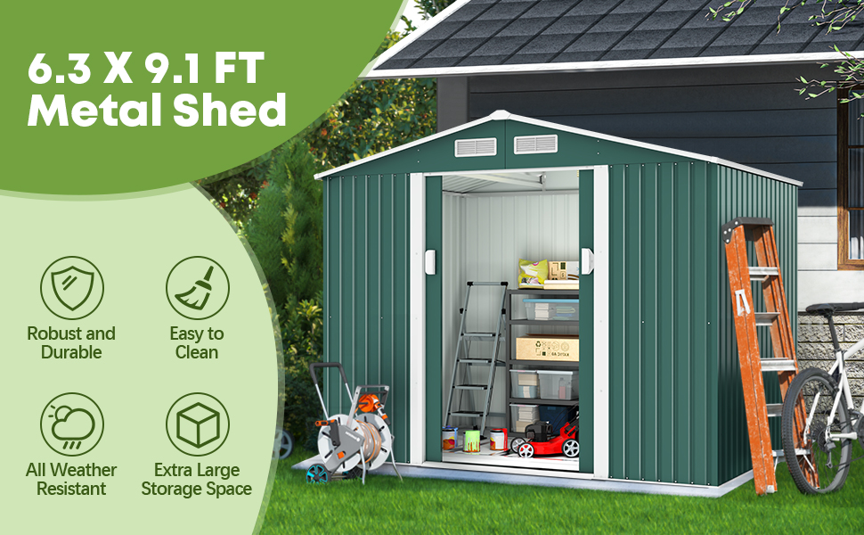 【AMPLE INTERIOR STORAGE WITH SLIDING DOOR】: Features a spacious storage inner (about 29 square feet), the metal shed with lockable double sliding doors is ideal to safely store gardening and landscaping supplies, bicycles, power tools, and other large items. The high walls allow you to walk vertically and DIY for tool hanging.