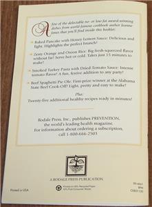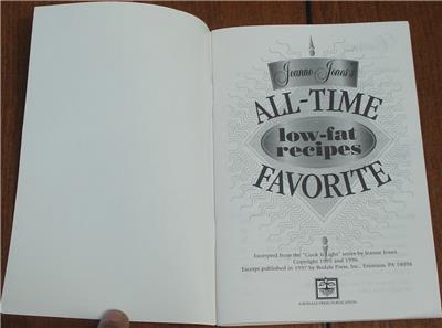 Today for consideration is this Recipe Booklet, Jeanne Jones's All Time Favorite Low-Fat Recipes. The booklet is in good condition, but does have some light stains on the cover, both front and back. The staple binding is good, and all 47 pages are intact. The booklet is an excerpt from the book, and was published in 1997 by the Rodale Press. It is a very nice little recipe booklet with some delicious sounding recipes...