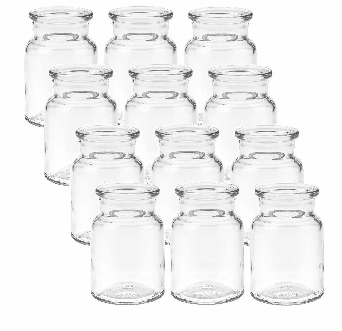 12 Hübsche kleine Flaschenvasen aus robustem Glas. Vintage Tischdeko - perfekt als Dekoration, Tischvase für Feierlichkeiten wie z.B zur Hochzeit, Taufe, etc. Höhe: 9 cm - Durchmesser: Ø 6,1 cm - Durchmesser Öffnung: Ø 3,1 cm - Fassungsvermögen: ca. 150 ml