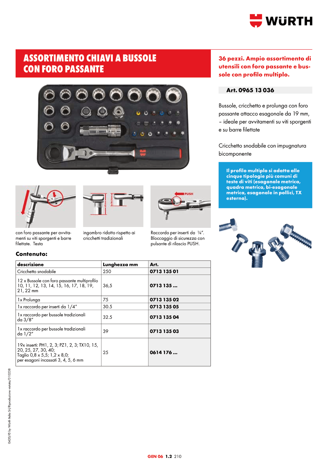Ampio assortimento di utensili con chiave a bussola passante e profilo multiplo. Il profilo multiplo permette di svitare le cinque più comuni tipologie di teste delle viti (esagonale, quadra e poligonale in misure metriche, esagonale misure in pollici, TX esterno).